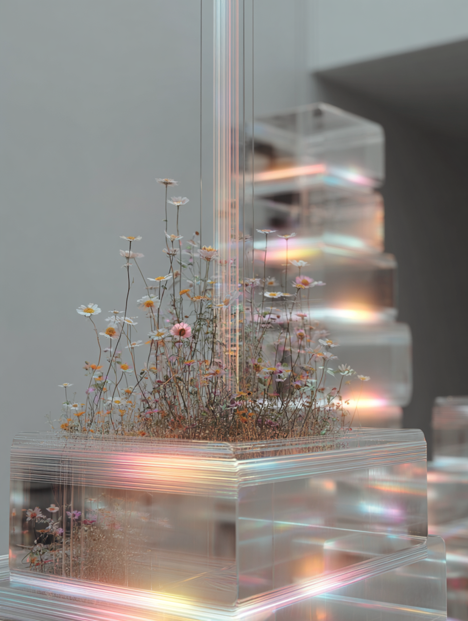 A stunning arrangement of wildflowers encased in a transparent prism, with refracted light creating a rainbow effect.