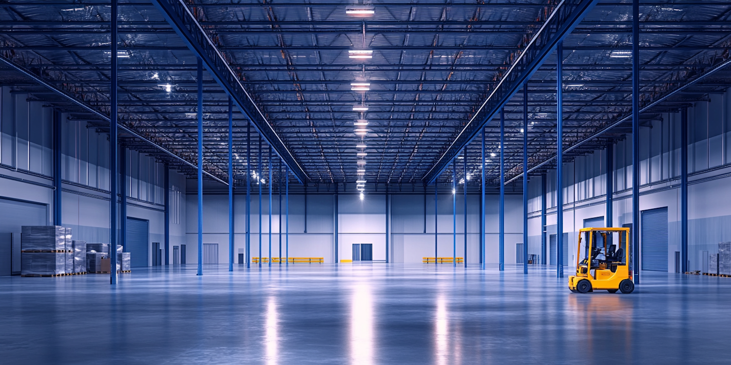 Spacious warehouse interior with blue beams, polished floors, and a yellow forklift. Neatly stacked pallets and closed roller doors add to the scene.