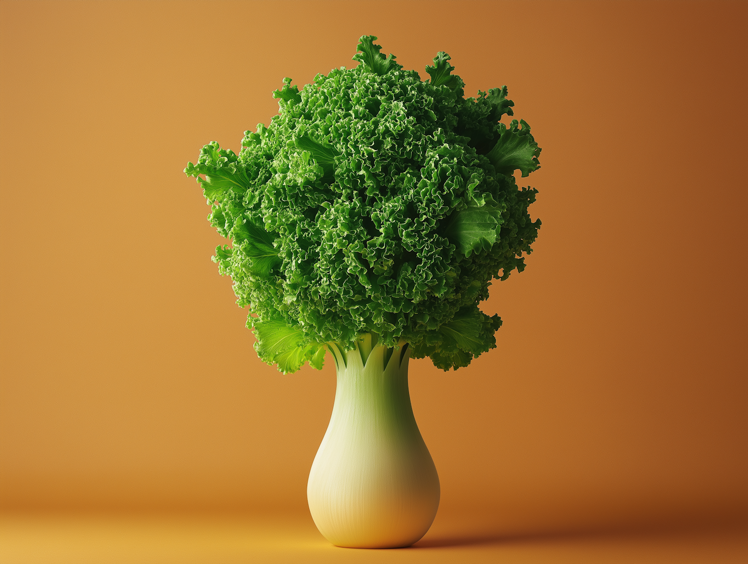 Vibrant green kale against a warm orange background, highlighting its lush, curly leaves and rich texture.