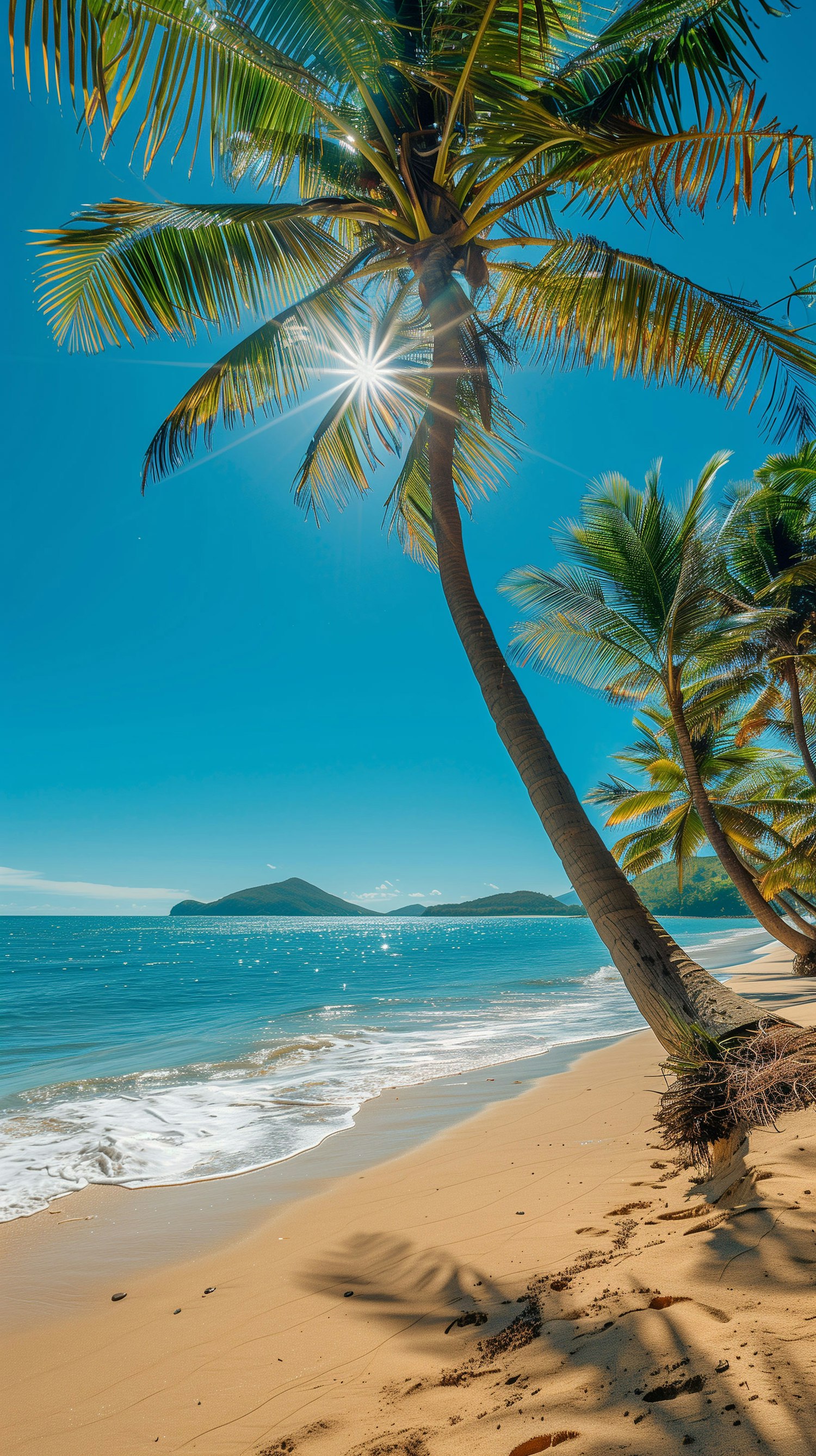 Idyllic tropical beach with golden sand, turquoise waters, leaning palm trees, and distant islands under a bright blue sky.