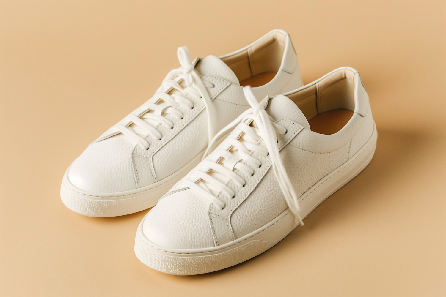 Elegant white leather sneakers on a beige background, showcasing minimalist design and subtle texture.