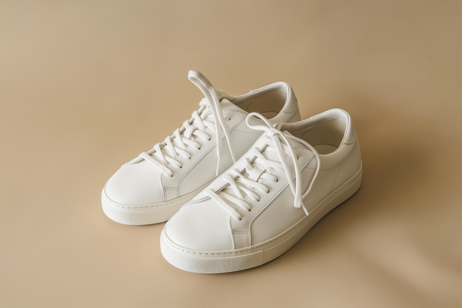 Minimalist white leather sneakers on a beige background, showcasing sleek design and modern style.