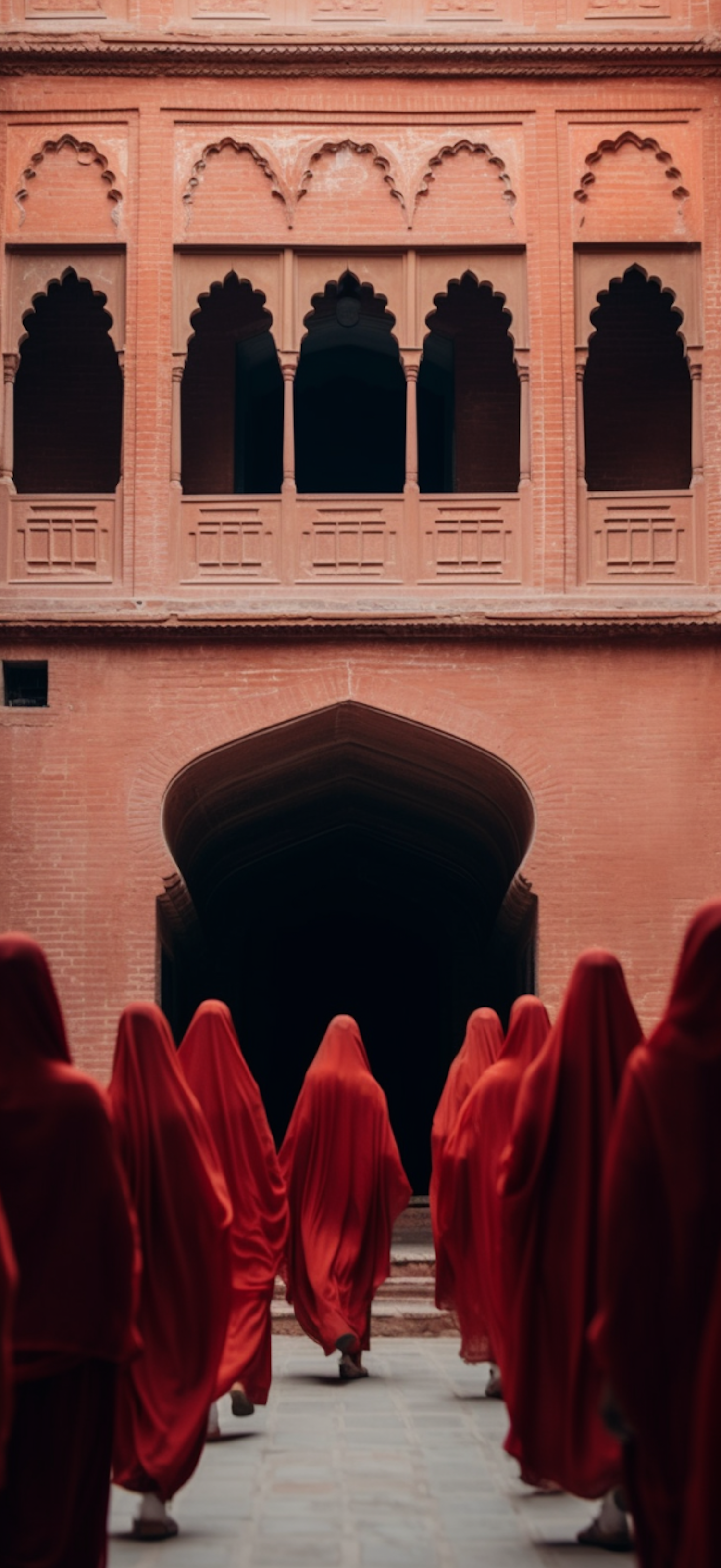 Monks in red robes walk towards a historic arched entrance, surrounded by intricate red brick architecture.