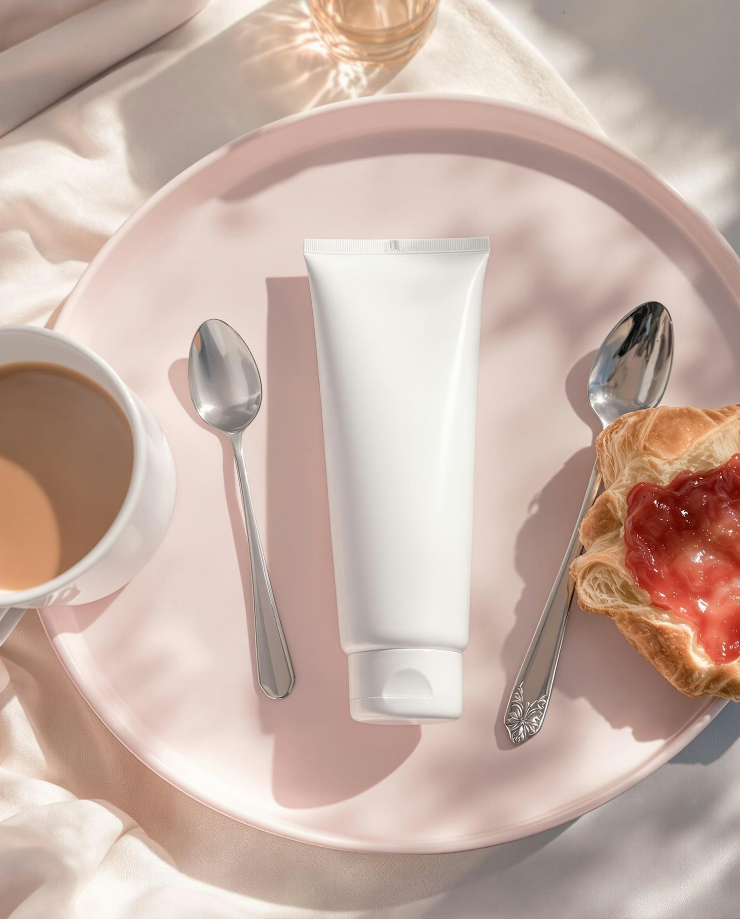 A blank white skincare tube placed on a pastel pink breakfast tray, next to a coffee cup, a spoon, and a croissant with strawberry jam. Soft morning light, everything in tones of pink, beige, and baby blue. The tube has no text or branding. Composition is centered and styled like a morning routine.