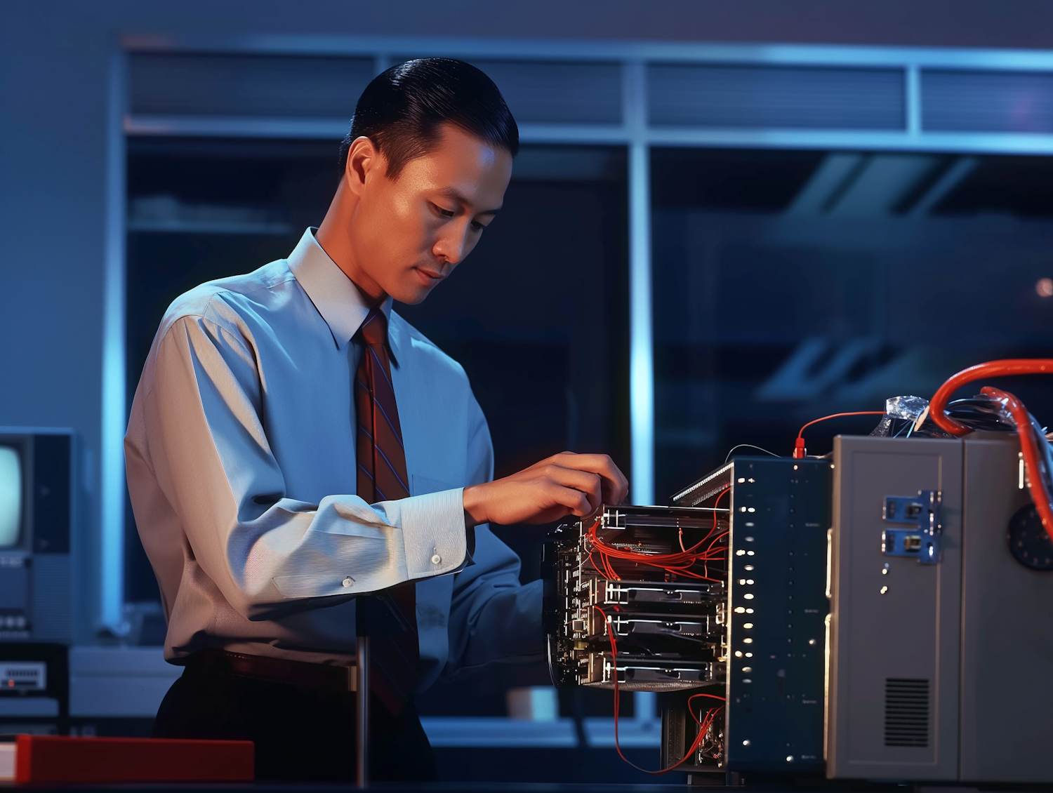 Asian man in a blue shirt and red tie working on electronic equipment in a dimly lit tech lab with a vintage computer monitor.