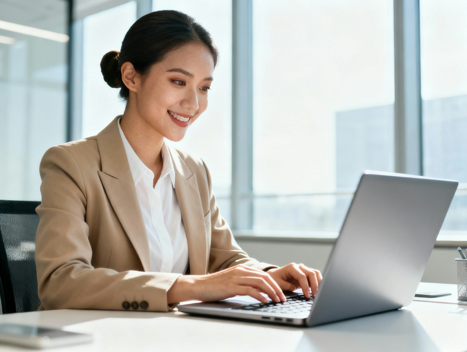 Studio portrait of a woman marketing coordinator, around 29; fair-medium skin (neutral); hair in low bun, natural makeup. Typing on laptop at a desk, modern bright office background; soft daylight (~6100 K), clamshell + gentle rim; 105 mm macro-sharp. Wardrobe: beige blazer over white blouse (non-branded). Expression: friendly, focused smile. Skin: natural glow, lightly smoothed. Negative as above.