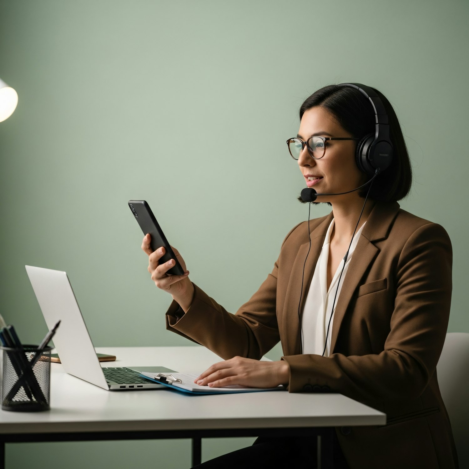 Professional woman in a headset working at a desk with a laptop and smartphone, set against a light green background.