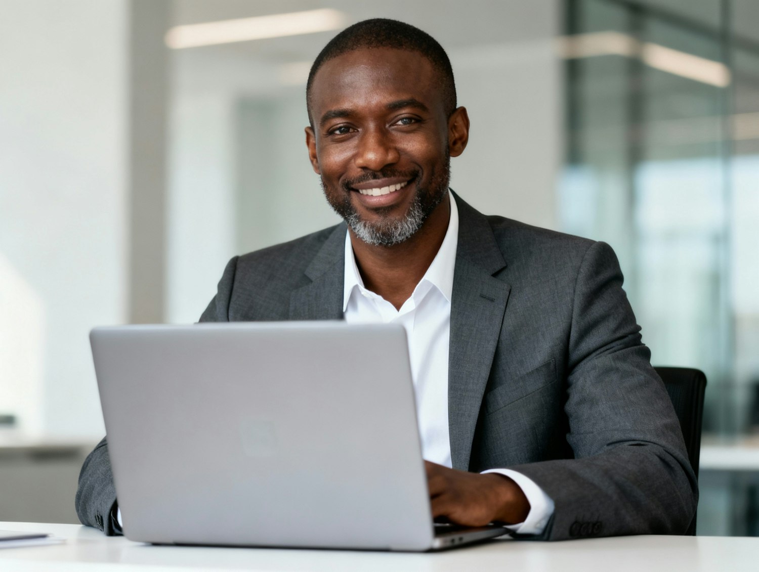 Studio portrait of a man operations manager, around 32; deep brown skin (cool-neutral); close-cropped hair, light beard. Working at a desk with laptop open, modern office background; soft daylight, clamshell soft key + gentle rim; 105 mm macro-sharp. Wardrobe: charcoal suit, white shirt, no tie (modern and clean). Expression: kind, focused, welcoming. Skin: natural glow, lightly smoothed, no shine. Negative: over-retouch, logos, clutter, strong shadows.