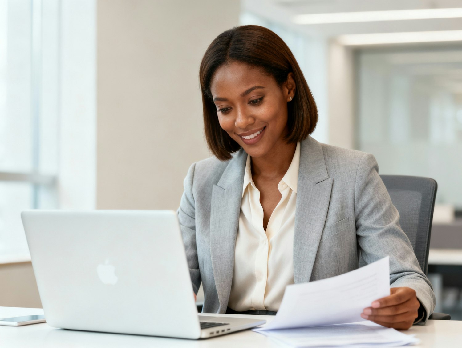 A professional woman in a modern office, smiling while working on a laptop and reviewing documents, dressed in a gray blazer.