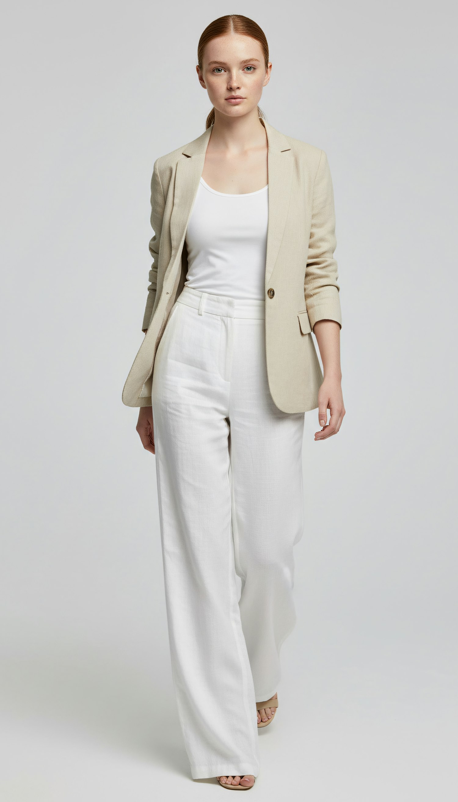 A woman in a beige blazer and white trousers stands confidently against a neutral background, showcasing a clean and professional look.