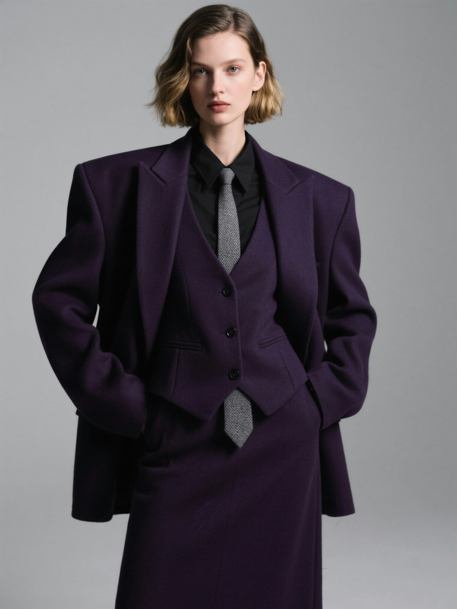 Studio fashion editorial close-up portrait of a woman with a dark blonde bob haircut, slightly wavy, exuding strength and femininity. The framing focuses on her upper body, showing the tailoring of the outfit. She is wearing an oversized very dark purple suit: a wide-shouldered blazer, a structured vest, and a matching long skirt. Underneath, she wears a fitted black shirt with a pointed collar and a textured gray tie. The fabrics appear structured and slightly heavy, emphasizing the volume and proportions of the tailoring. The background is a seamless neutral gray studio backdrop, smooth and uniform with no floor separation. Lighting is soft and evenly diffused, producing subtle shadows that define the shapes and textures of the fabrics. The art direction is minimal, modern, and editorial, focusing on presence, attitude, and the impact of deep-colored oversized tailoring.