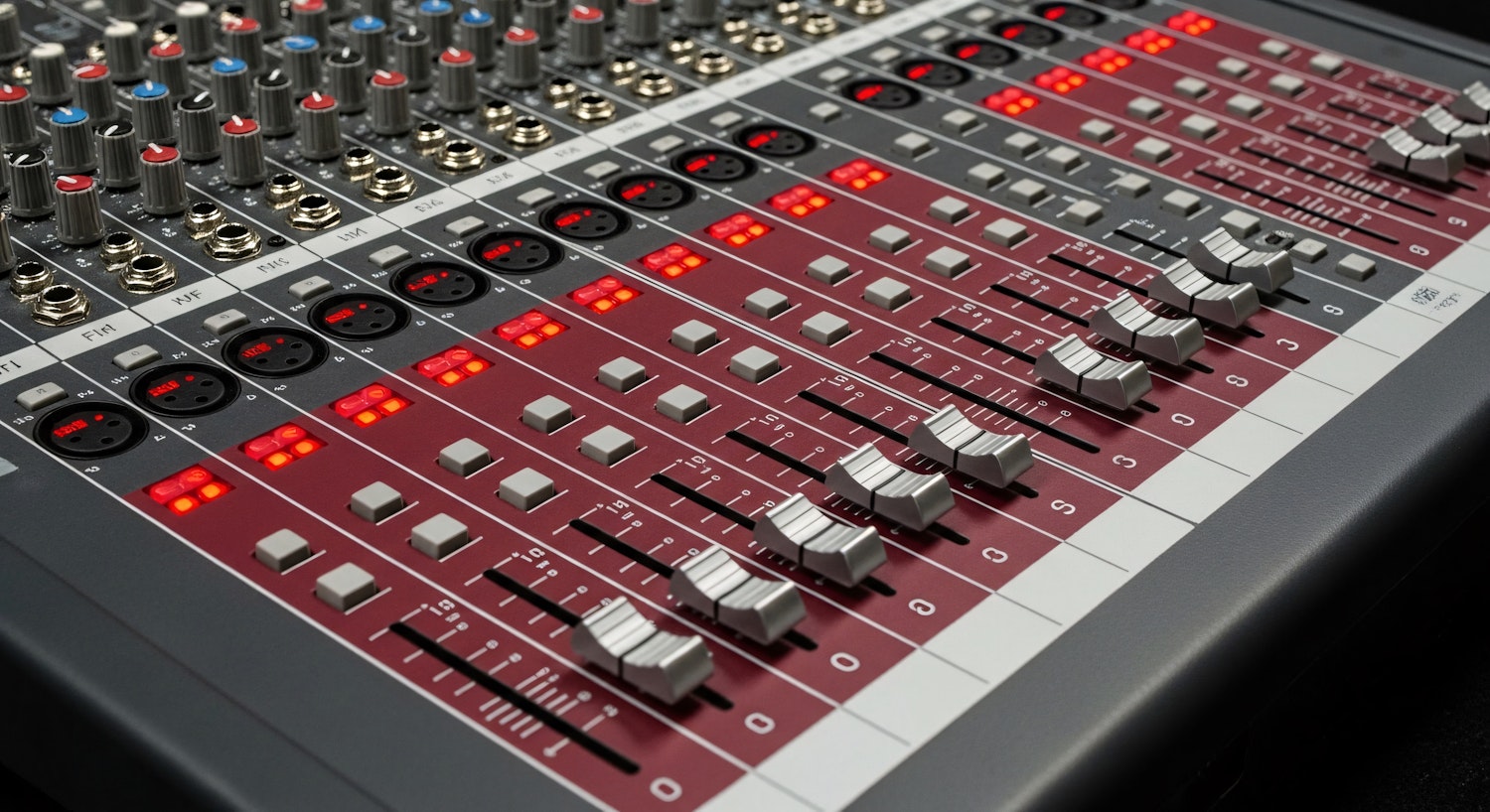 Close-up of a professional audio mixing console with red and gray faders, illuminated controls, and input connectors for sound engineering.