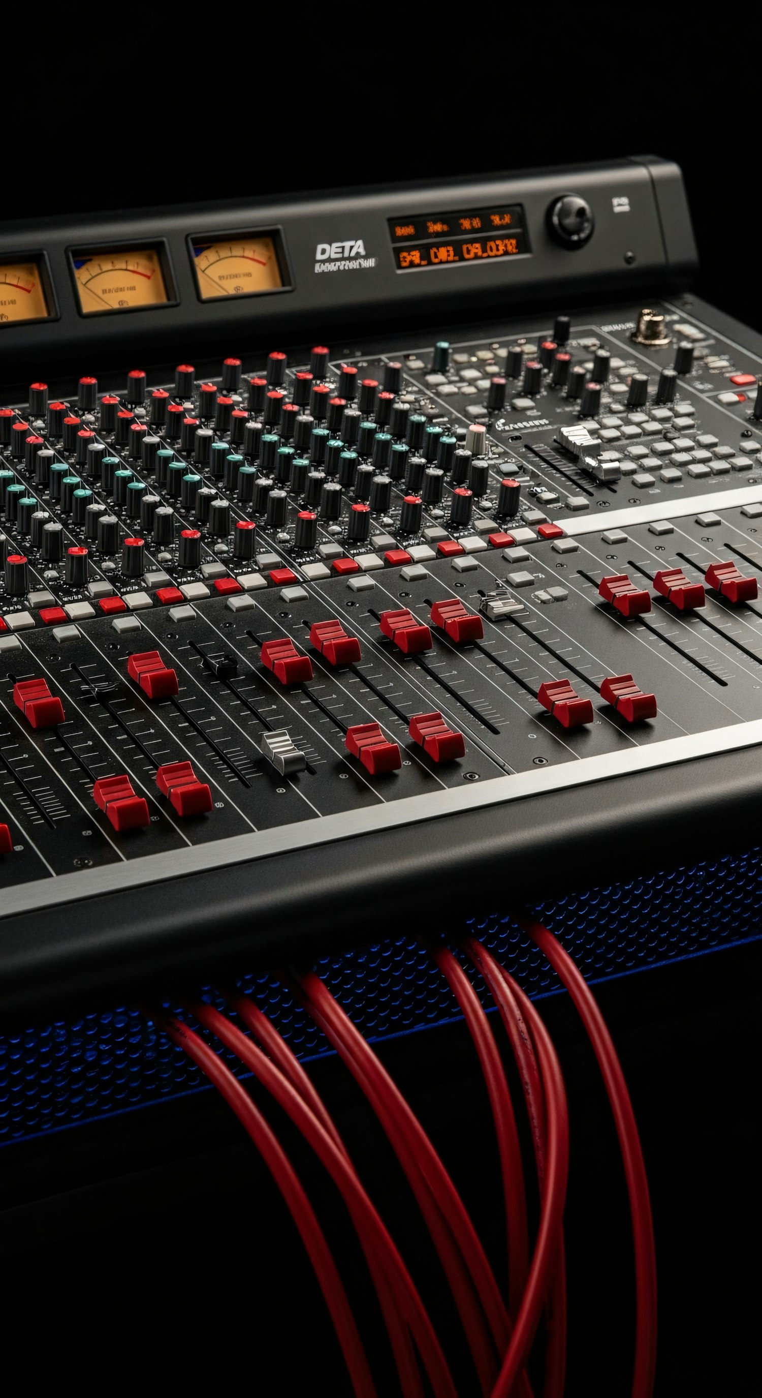 Professional audio mixing console with red sliders, analog VU meters, and digital display, connected with vibrant red cables.