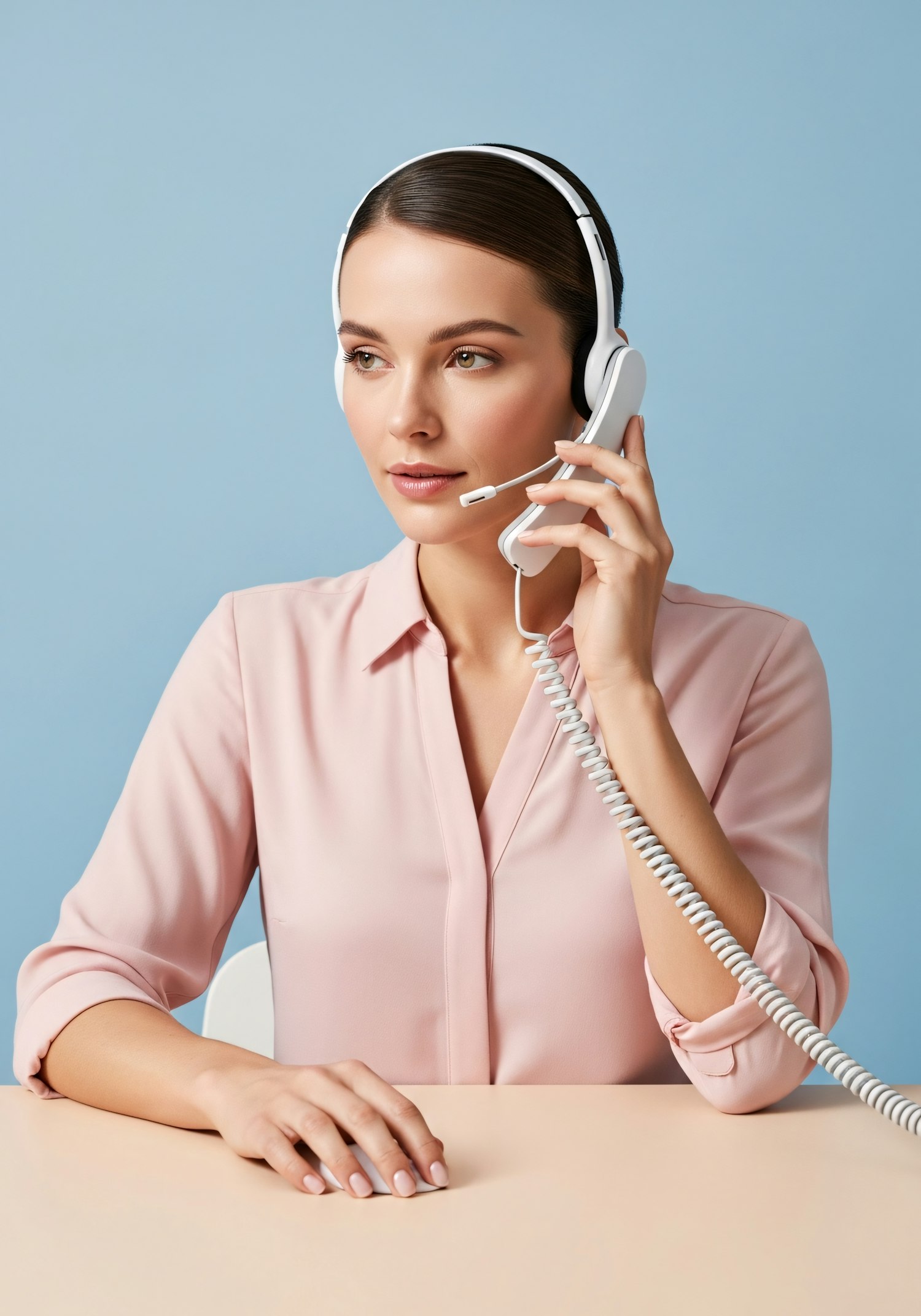 Professional woman in a pink blouse using a white headset, set against a clean blue background, conveying communication and focus.