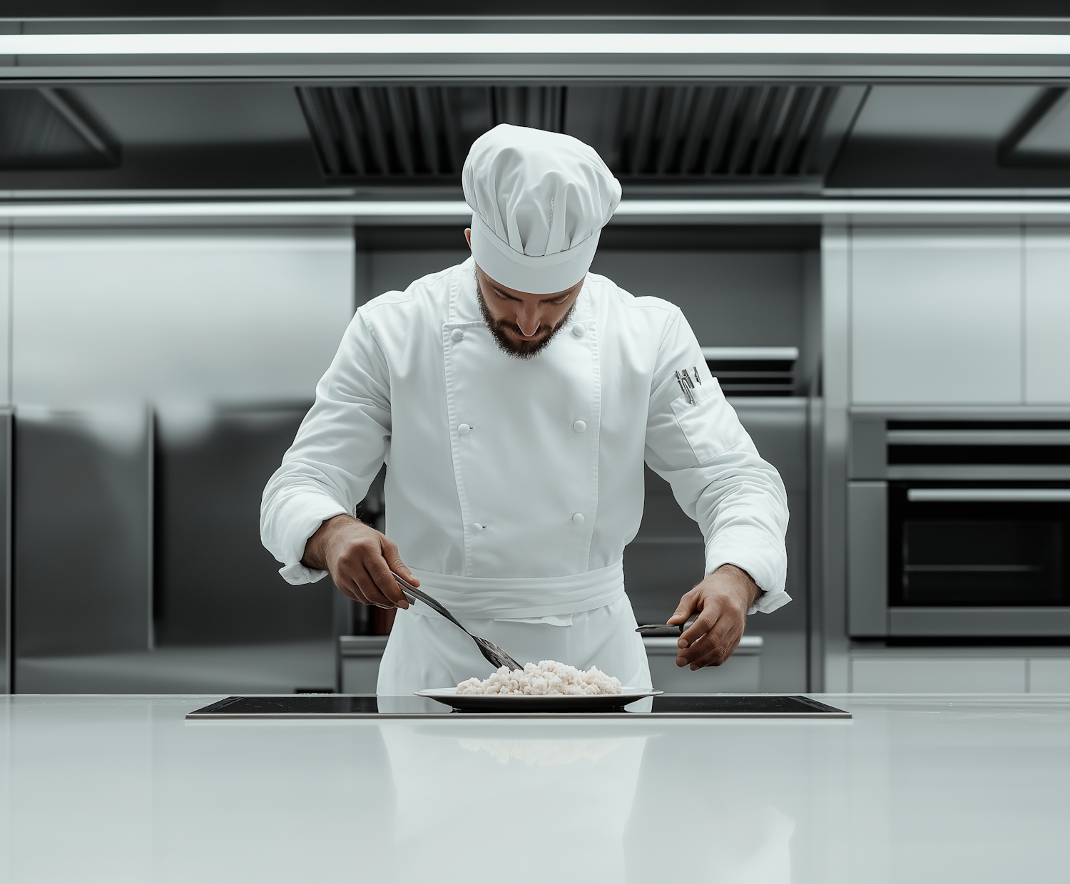 Chef in a modern kitchen meticulously plating a dish, showcasing culinary precision and a sleek, professional environment.