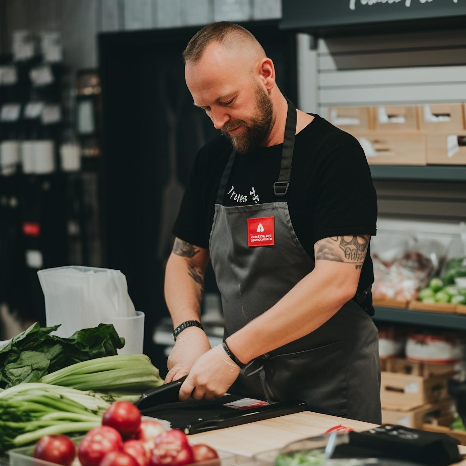 Chef chopping fresh vegetables in a kitchen, wearing a gray apron with tattoos visible on arms. Fresh produce surrounds him.