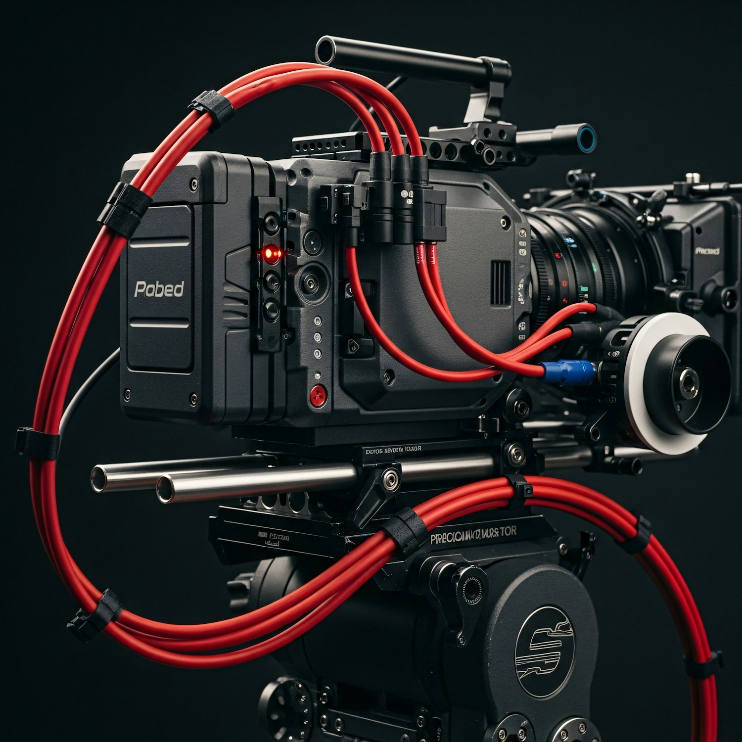 Close-up of a professional cinema camera rig with red cables, a follow focus system, and a robust lens, mounted on a sturdy rig.