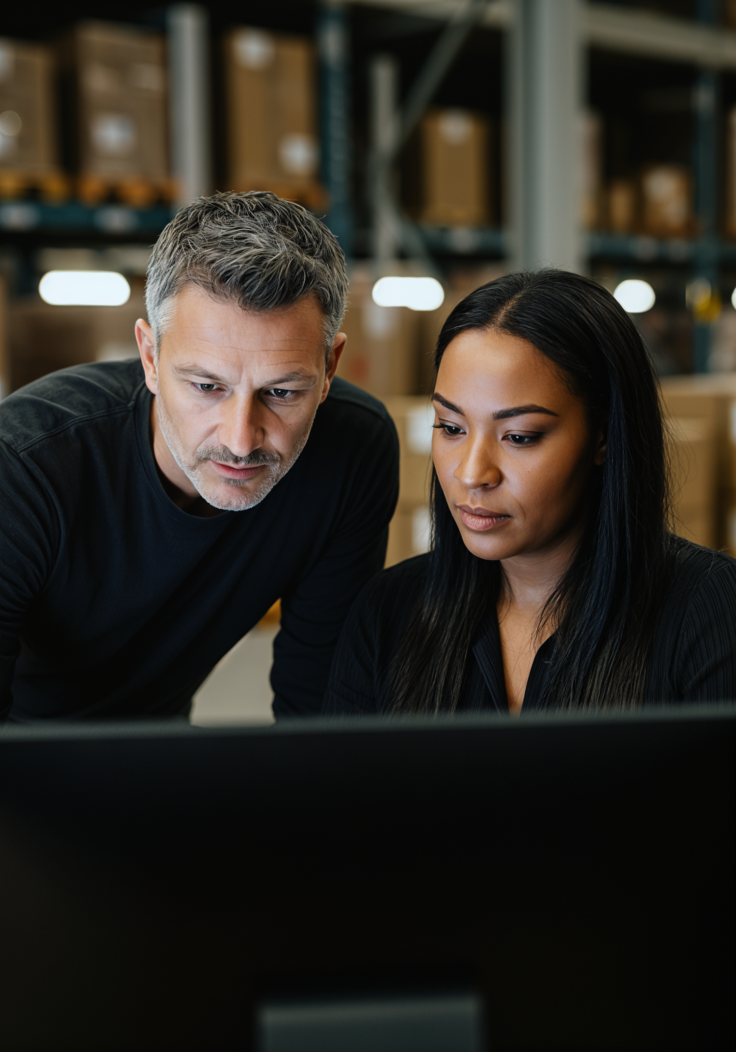 Two professionals collaborate in a warehouse setting, focused on a computer screen, showcasing teamwork and productivity.