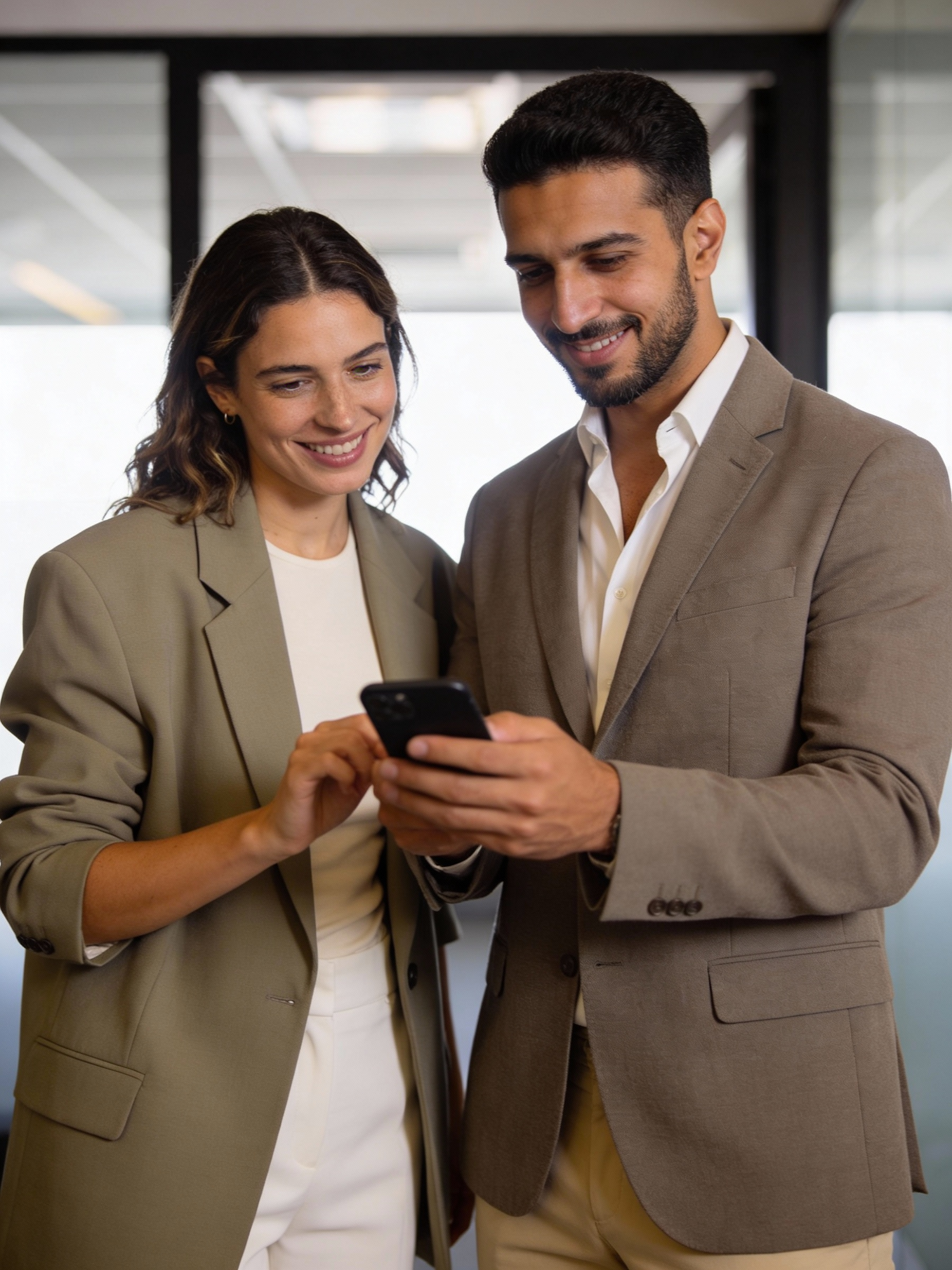 Two professionals in beige blazers share a moment of collaboration, smiling as they look at a smartphone in a modern office setting.