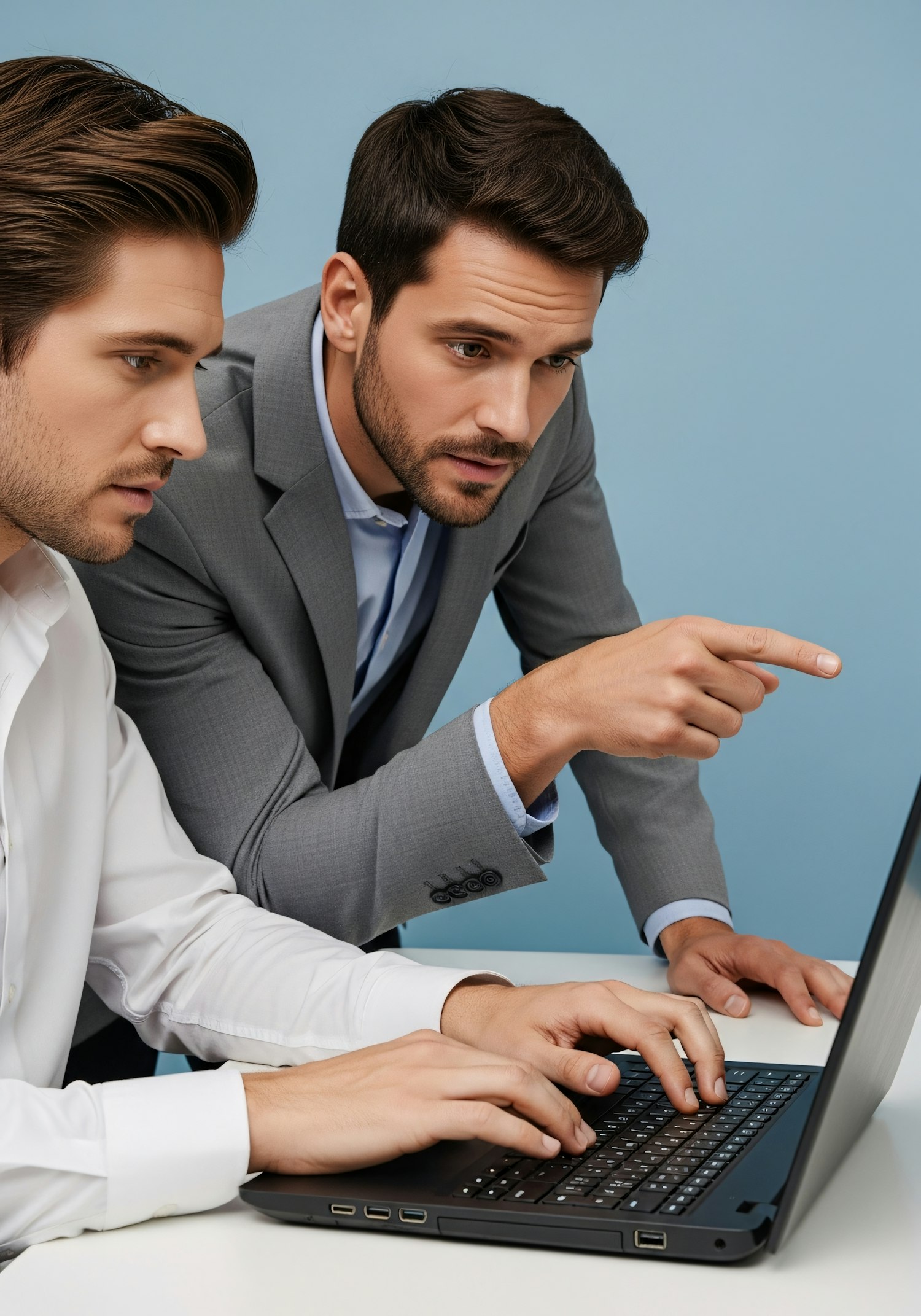 Two professionals collaborating on a laptop, one typing and the other pointing at the screen, set against a light blue background.