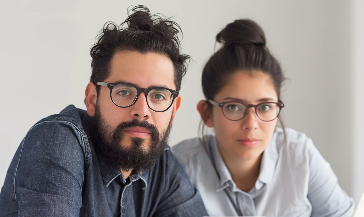 A man and woman with glasses, both with dark hair in buns, pose together in casual shirts against a light background.