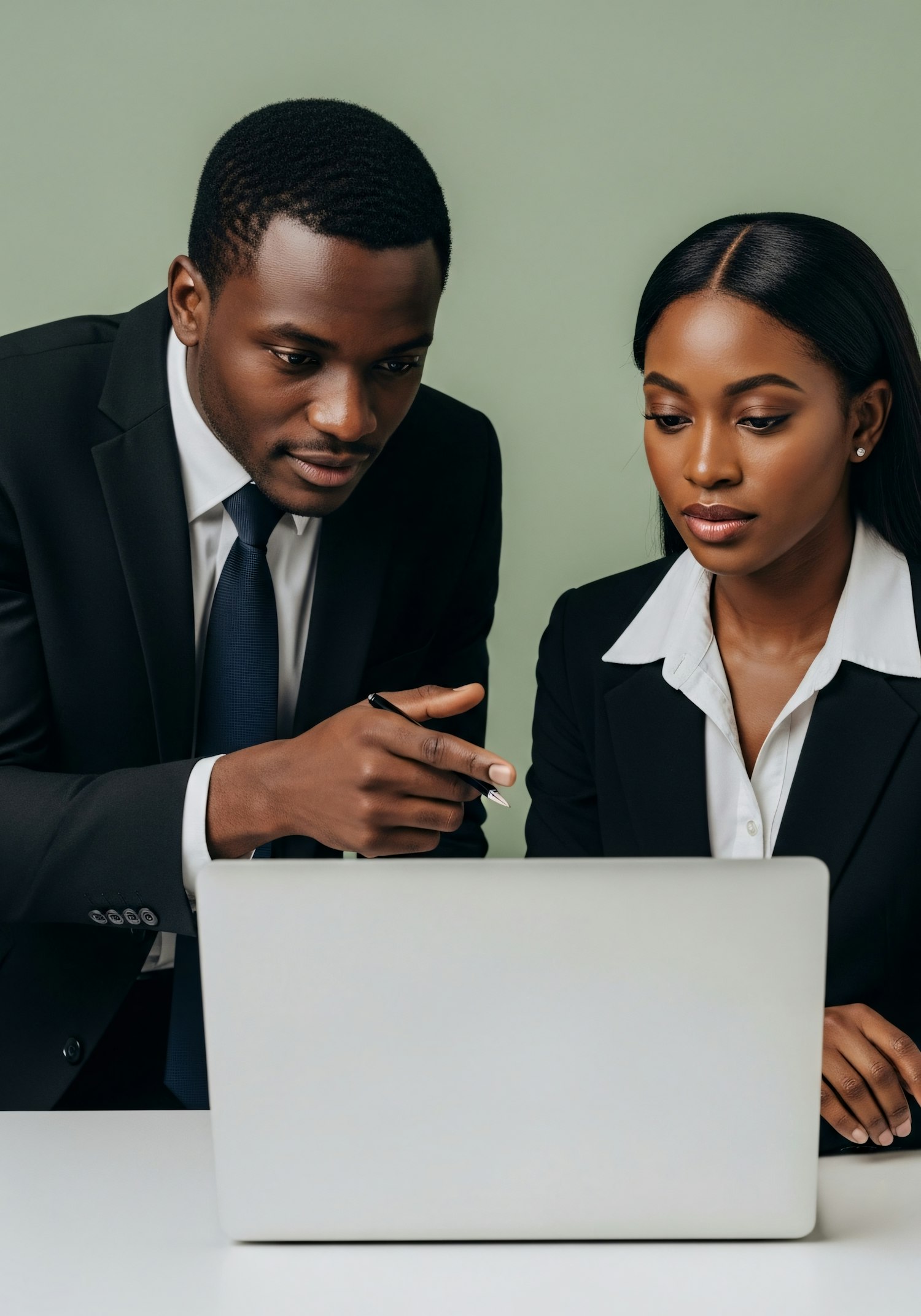 Two professionals in suits collaborate over a laptop, discussing and analyzing information in a focused and engaged manner.