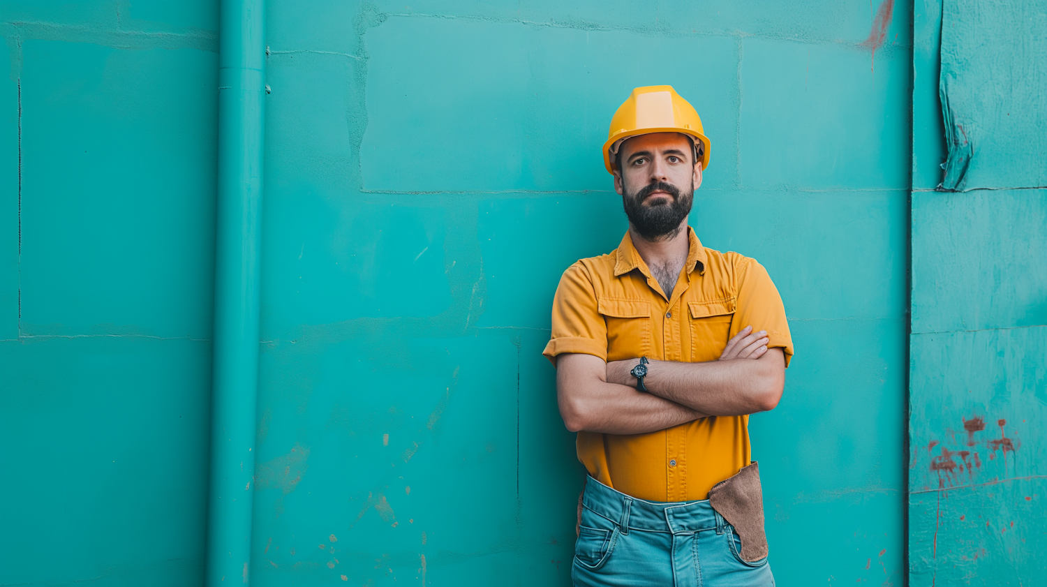 Confident construction worker in yellow hard hat and shirt, standing against a teal wall with arms crossed.