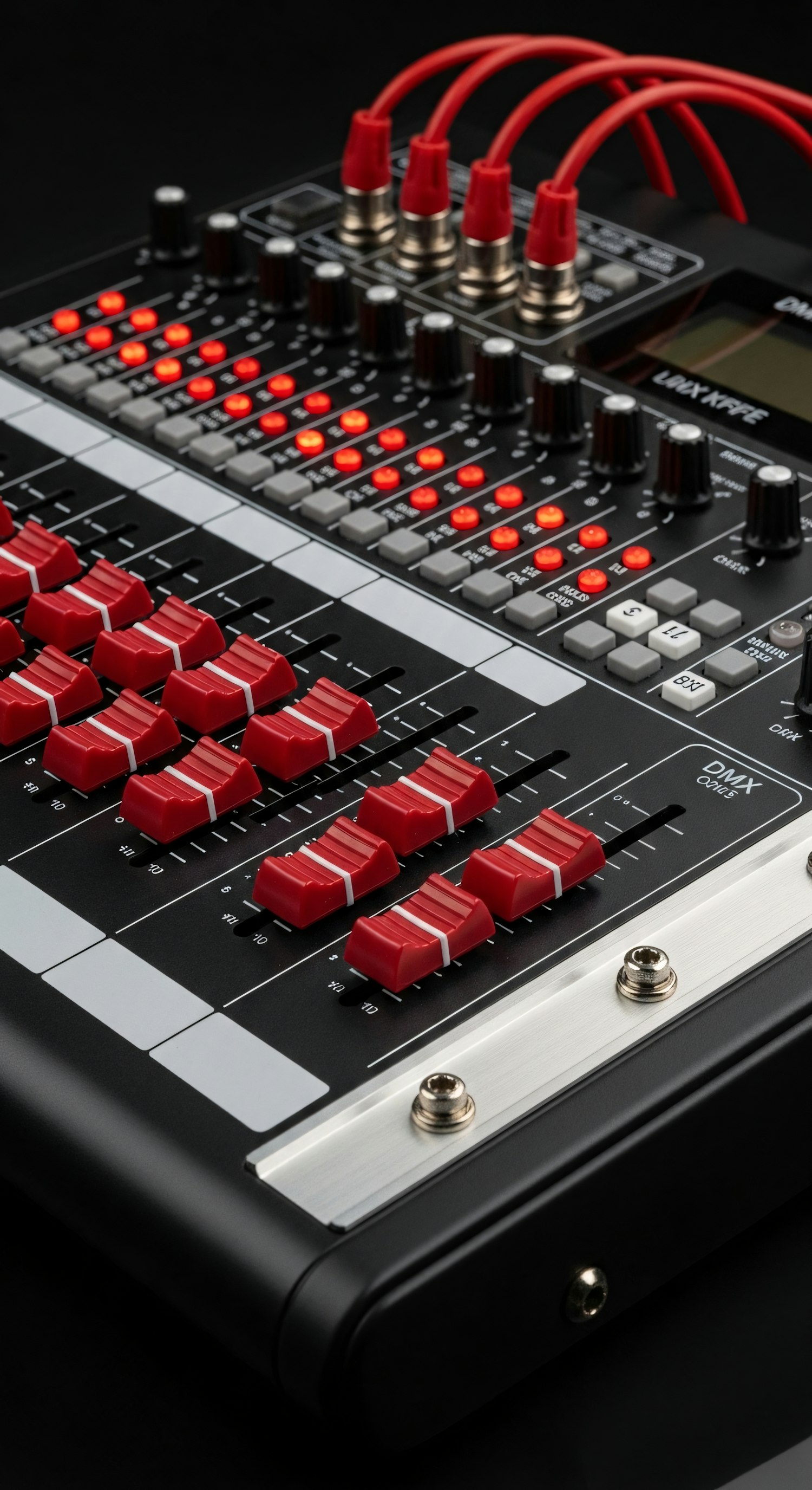 Close-up of a professional control panel with red sliders, knobs, and illuminated buttons, connected with red cables for precise adjustments.