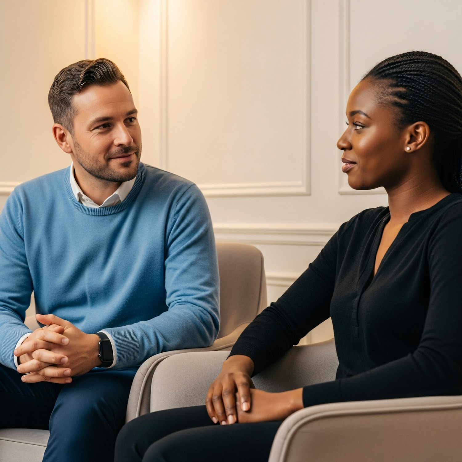 A man and woman seated in a professional setting, engaged in a conversation, with a calm and focused atmosphere.