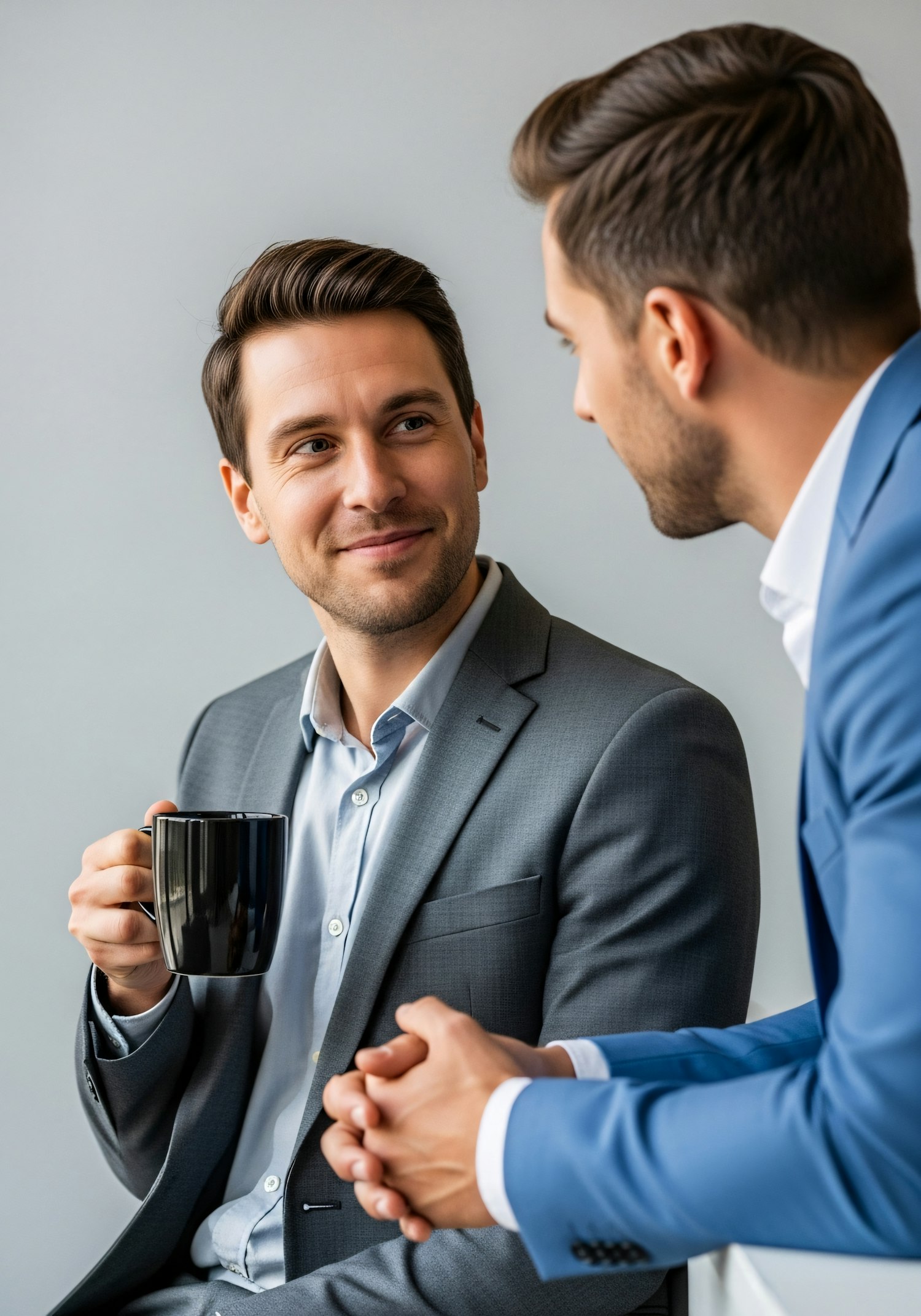 Two men in suits having a friendly conversation, one holding a coffee mug, in a professional setting with a neutral background.