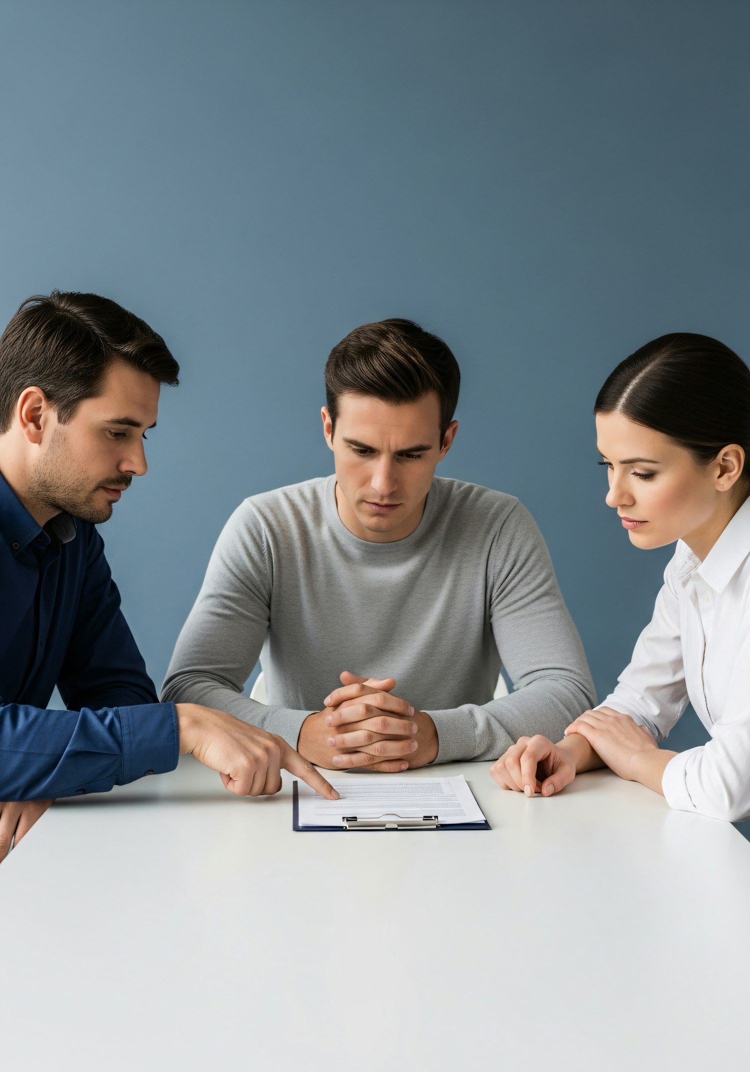 Three people discussing a document at a table, with a professional and focused atmosphere.