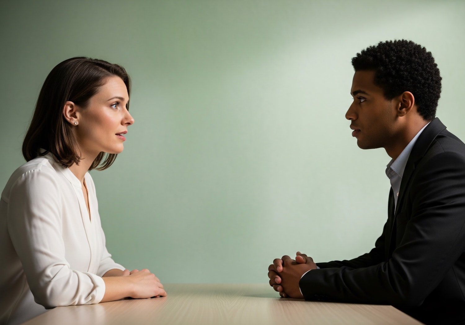 A man and woman sit across a table, engaged in a focused conversation, set against a plain light green background.