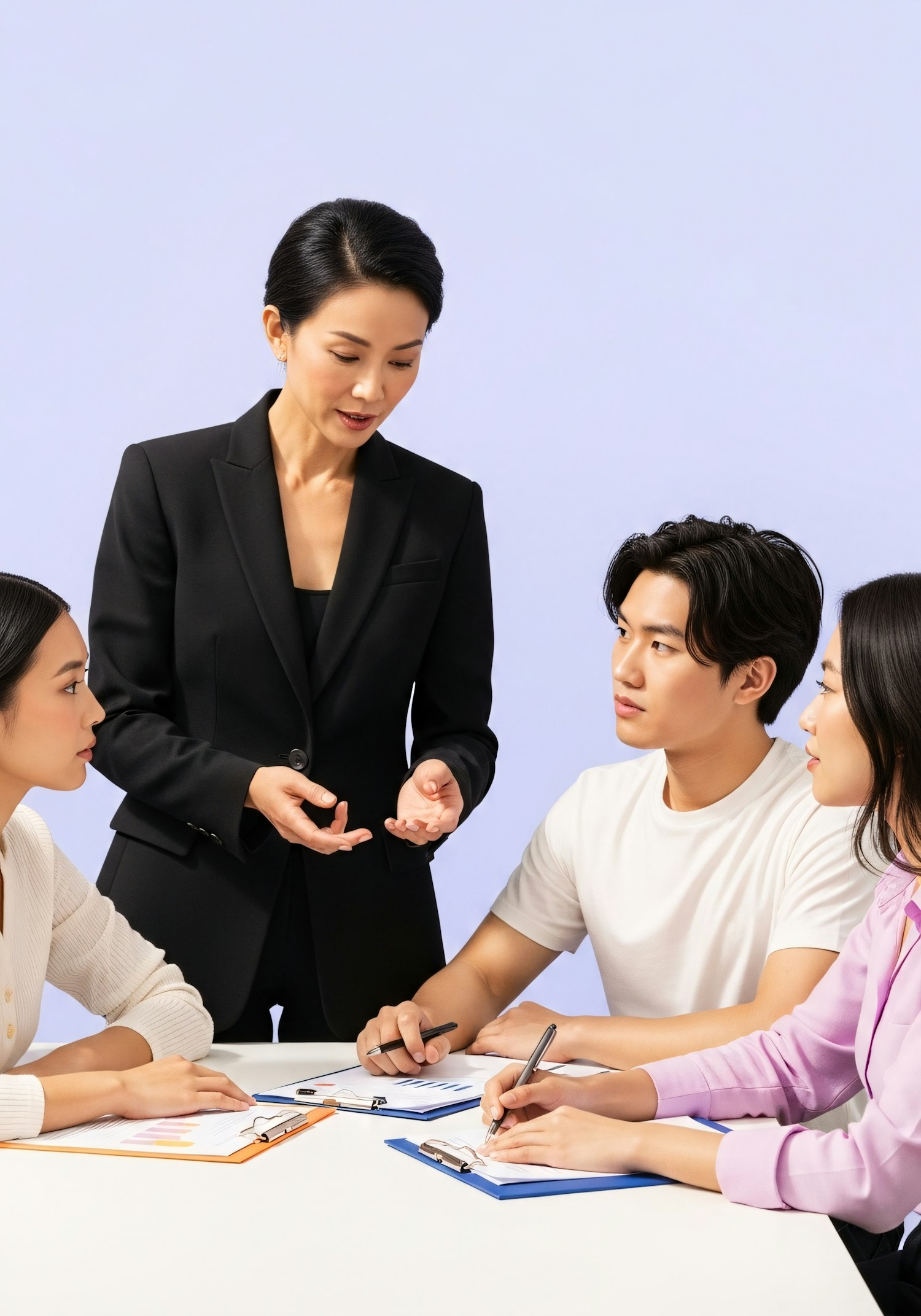 A professional meeting with a woman presenting to three attentive individuals taking notes, set against a clean pastel background.