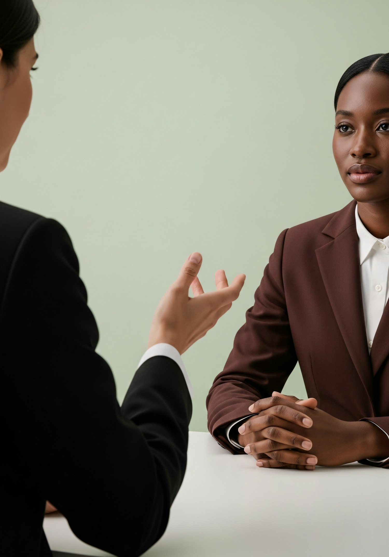 Two professionals in a discussion, one in a maroon blazer and the other in a black suit, against a neutral green background.