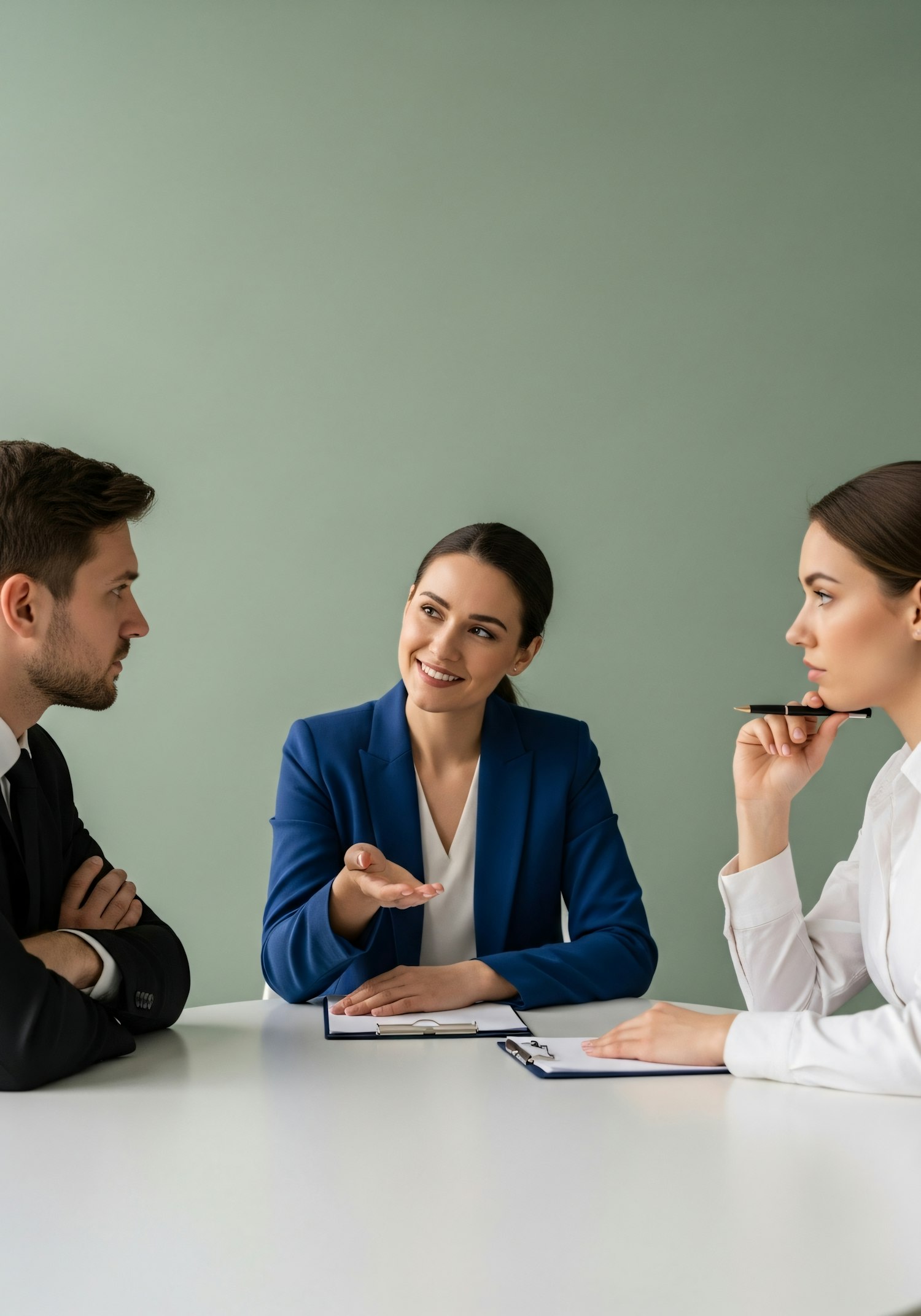 Three professionals in a discussion, with one presenting an idea while others listen attentively, set against a plain green background.
