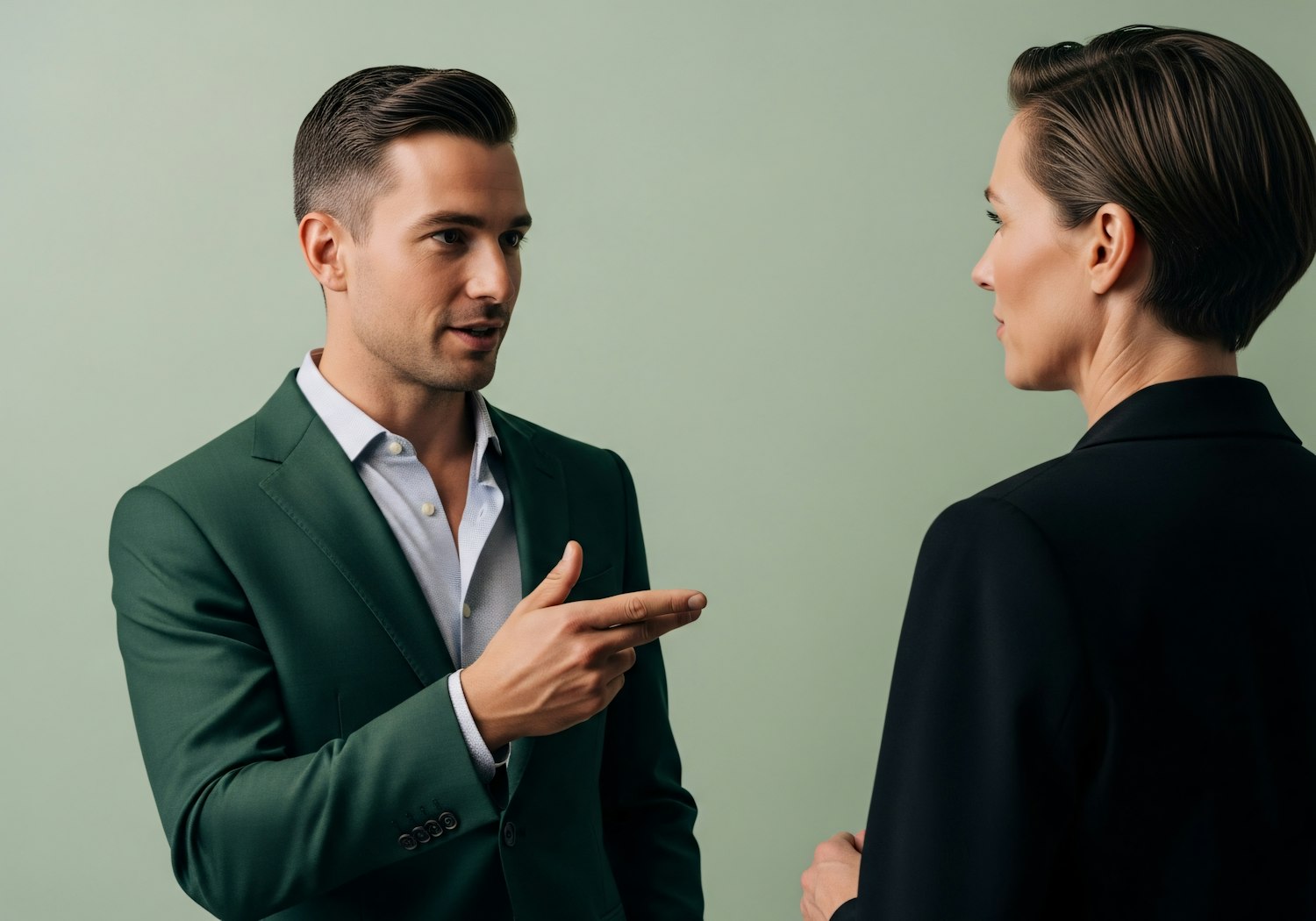 A man in a green suit and a woman in a black blazer are having a professional conversation against a light green background.
