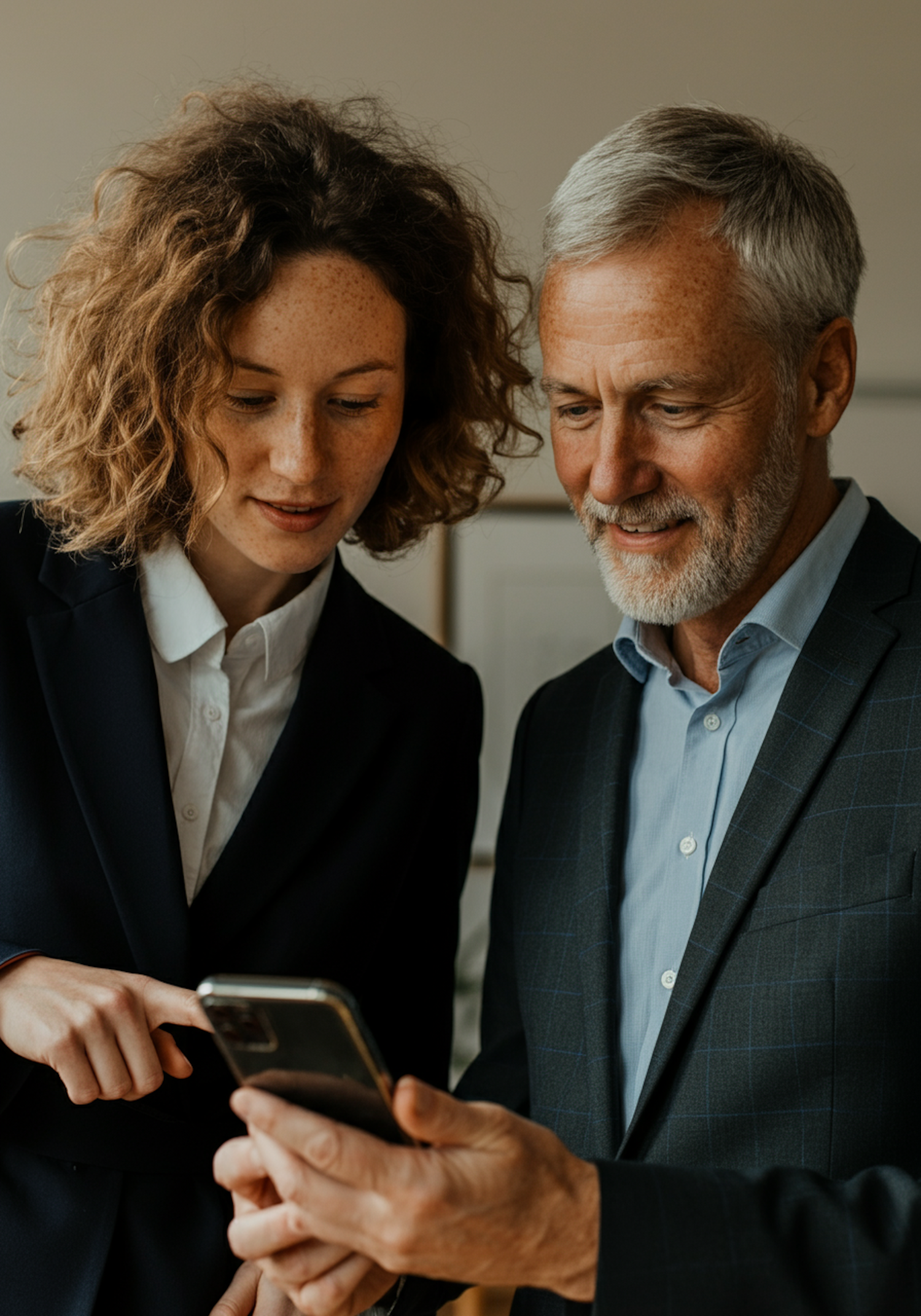 A professional man and woman collaborate while reviewing a smartphone screen, dressed in business attire in a neutral office setting.