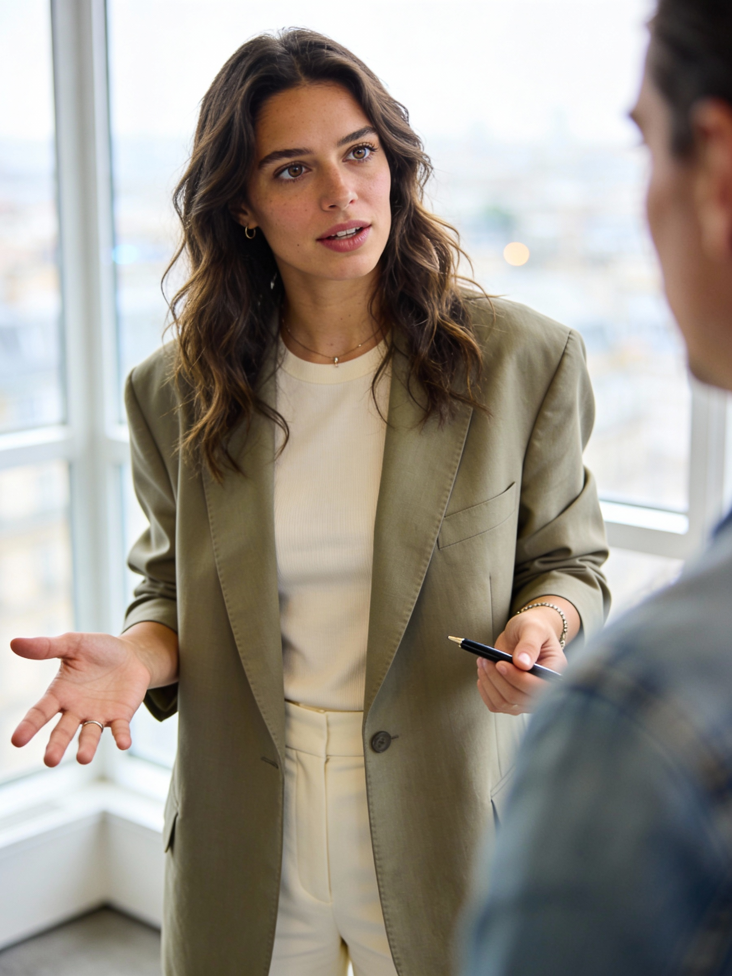 Ultra-realistic professional portrait of a confident French woman, late 20s–early 30s. Half-body waist-up, dynamic candid conversation; she speaks with a natural open-hand gesture while holding a pen in the other hand. A colleague is more visible (softly blurred partial face + shoulder) facing her. She is not looking at the camera; her gaze is on the colleague. Hair: loose wavy worn down, natural volume. Outfit: pale khaki oversized blazer over a cream top, tailored cream trousers implied; minimal jewelry. Background: bright modern office window corner with soft bokeh and a faint cityscape hint through glass, strongly blurred. No denim, no sunglasses. Locked shoot settings: soft window daylight + gentle fill, clean catchlights, subtle rim light, premium corporate/editorial retouch, natural skin texture, 85mm look, shallow depth of field, clean neutral slightly warm color grade, high-end corporate photography, no readable text, no logos, no watermark.