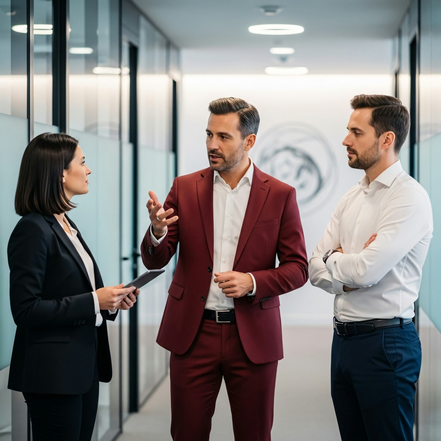 Three professionals in a modern office hallway engaged in a discussion, showcasing a collaborative and professional environment.