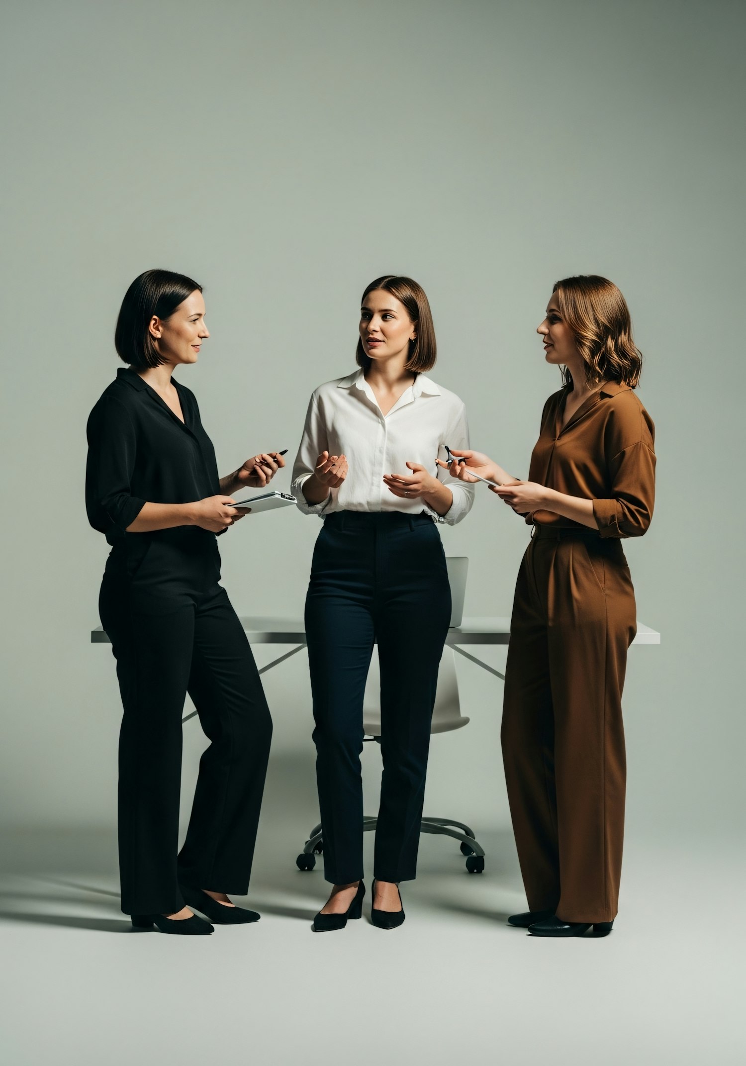 Three women in professional attire discussing ideas in a modern office setting, showcasing collaboration and teamwork.