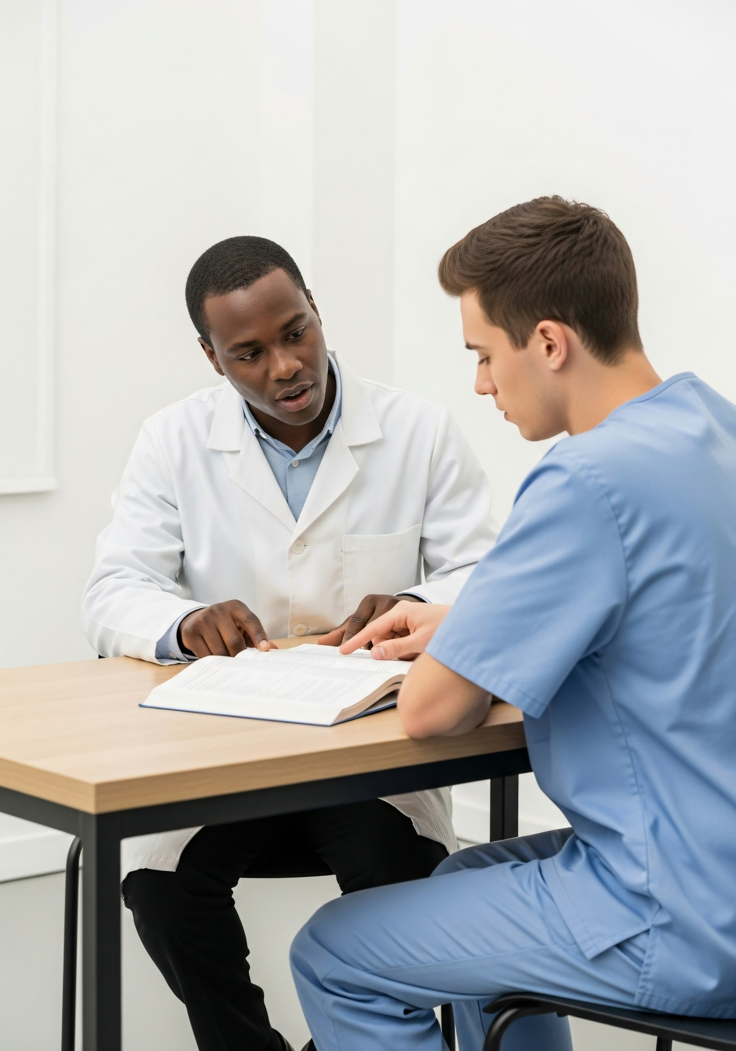 A professional discussion between a doctor and a medical student, focusing on a book in a clean, clinical setting.