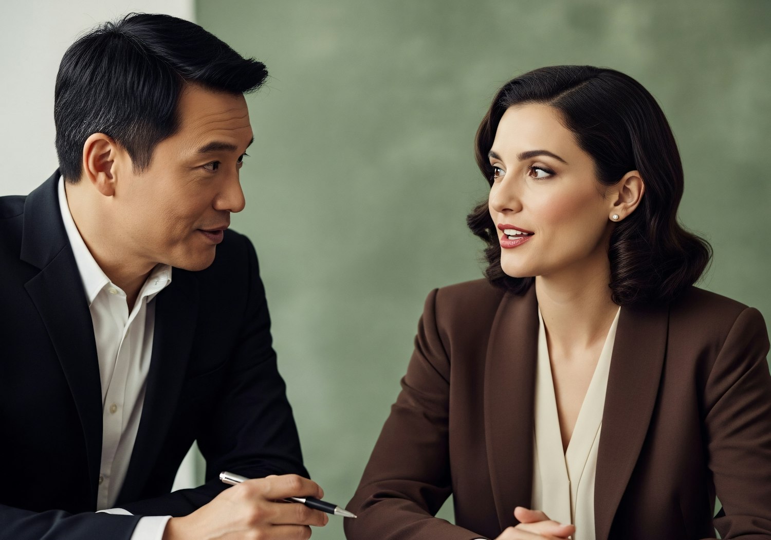 Two professionals in a discussion, one holding a pen, set against a neutral green background, conveying a collaborative atmosphere.