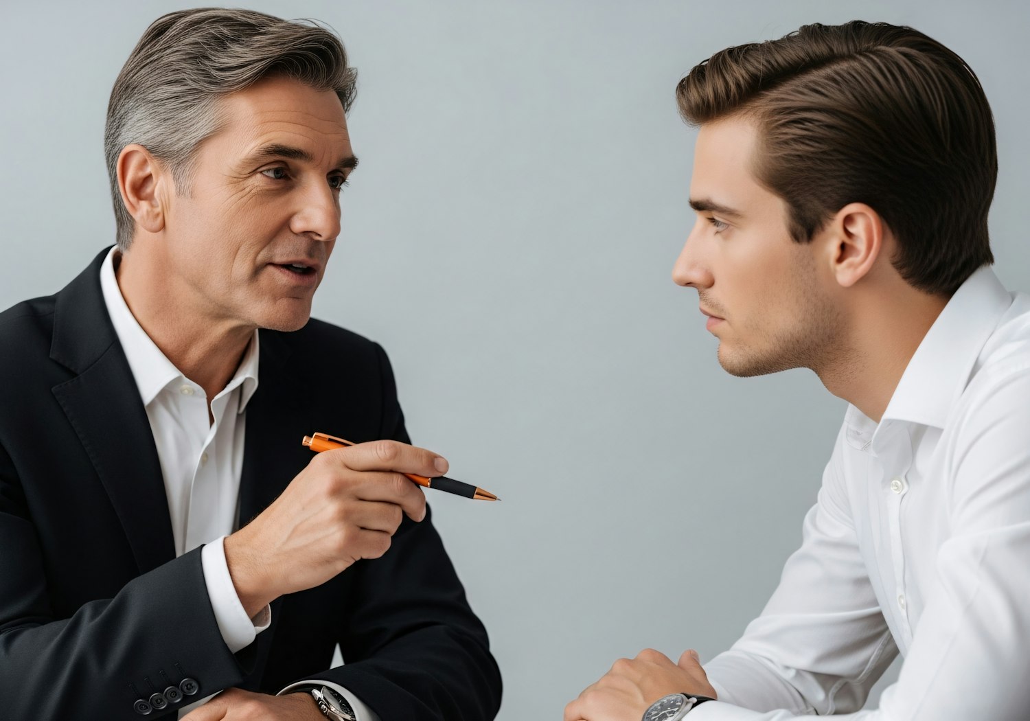 Two men in a professional discussion, one gesturing with a pen, the other listening attentively, set against a neutral background.