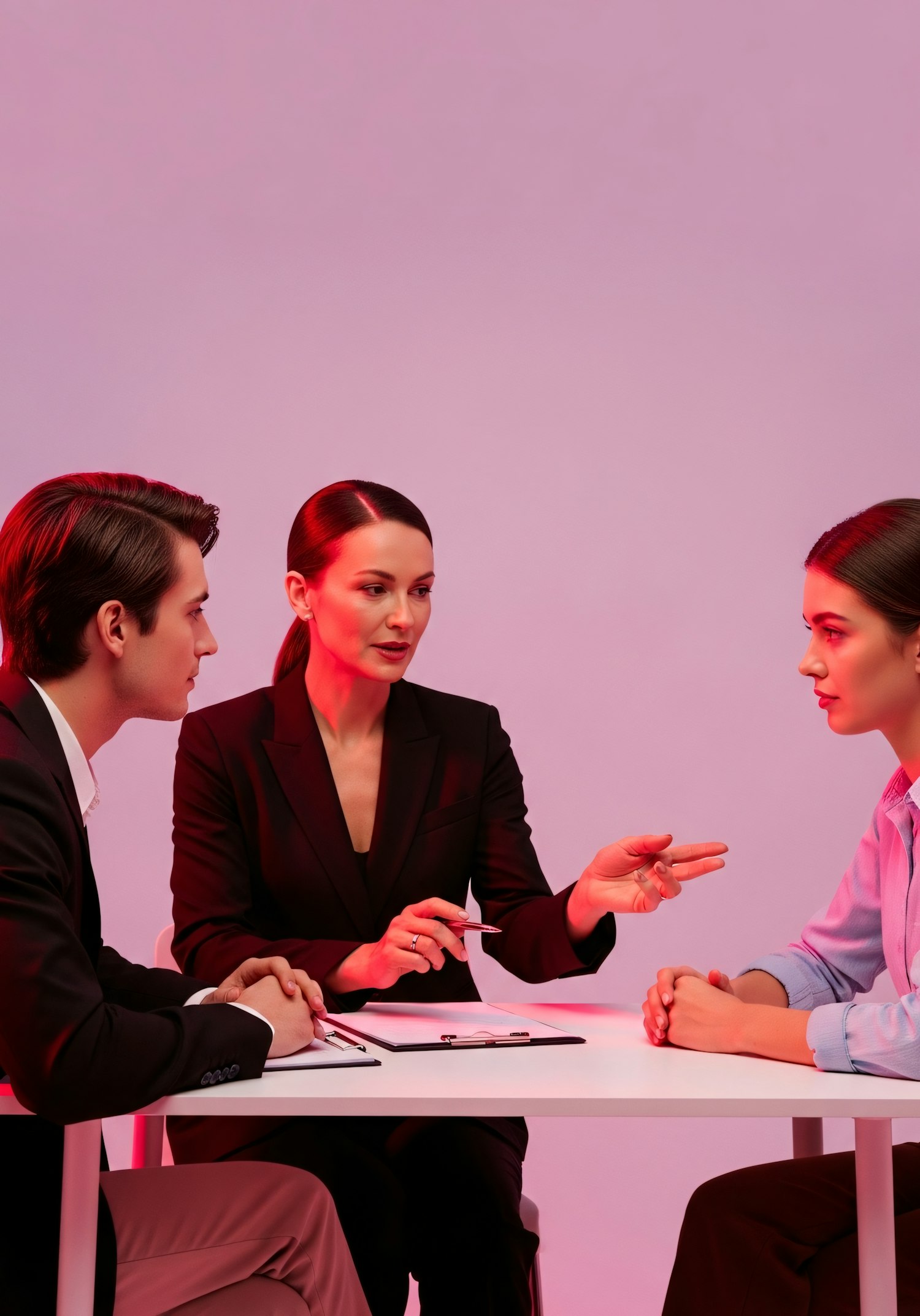Three professionals engaged in a discussion at a table, set against a modern pink gradient background.