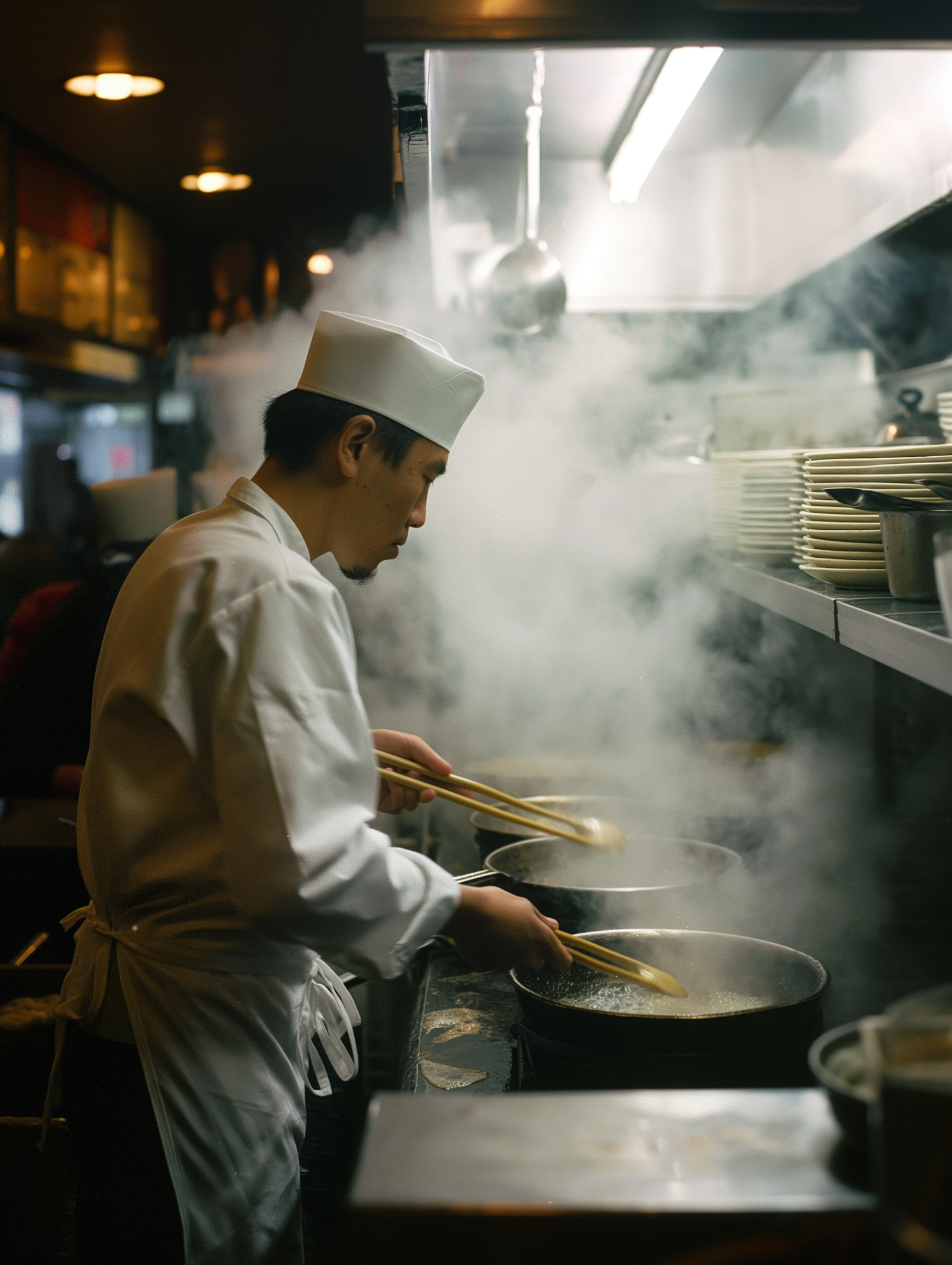 Asian chef in a bustling kitchen, cooking with chopsticks amidst steam and warm lighting, wearing a traditional white uniform.