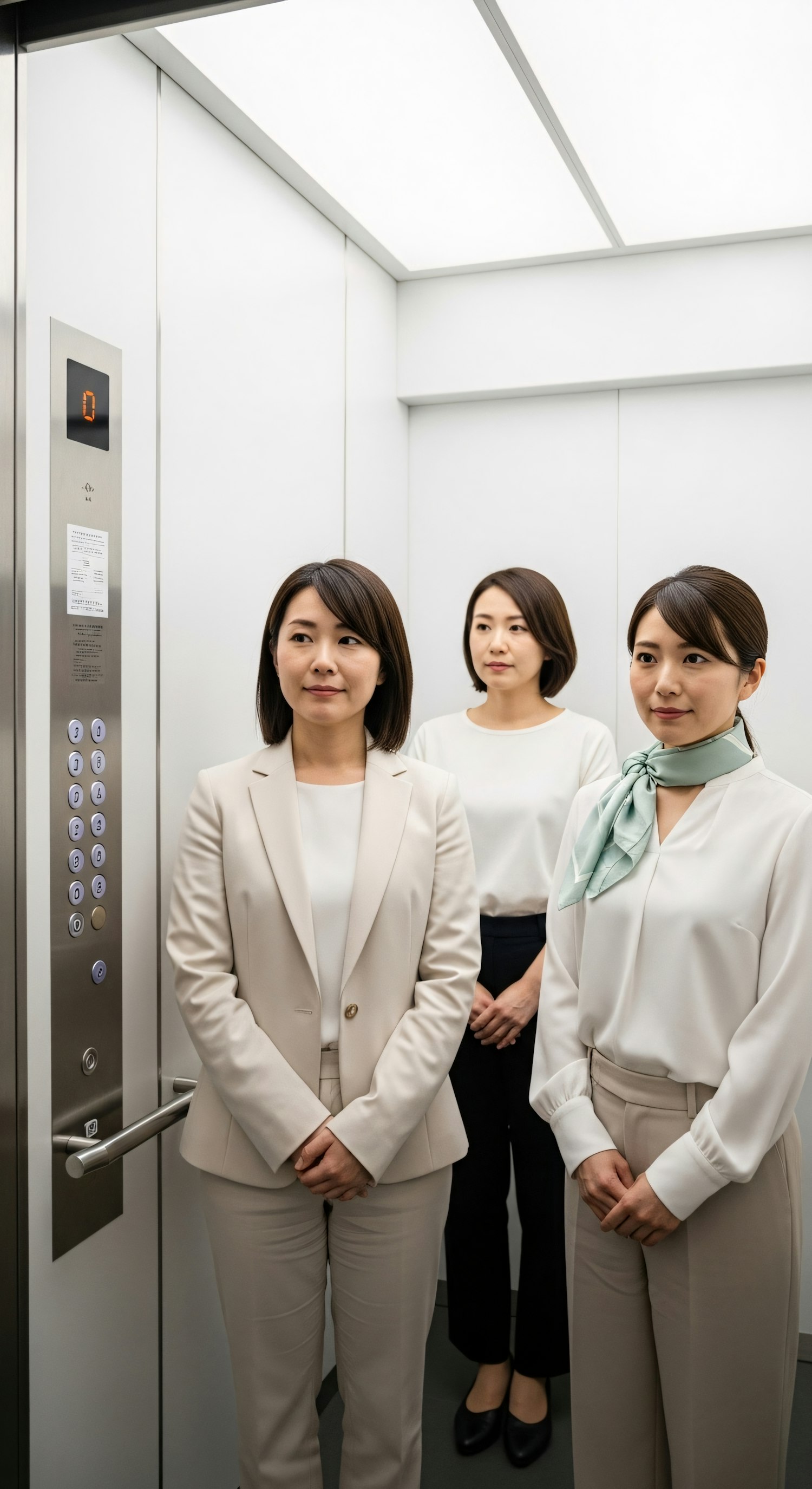 Three professionally dressed women standing in a modern elevator with bright lighting and a sleek design.