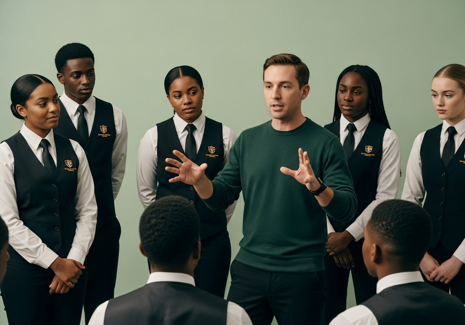 A professional group discussion with a man instructing uniformed individuals against a light green background.