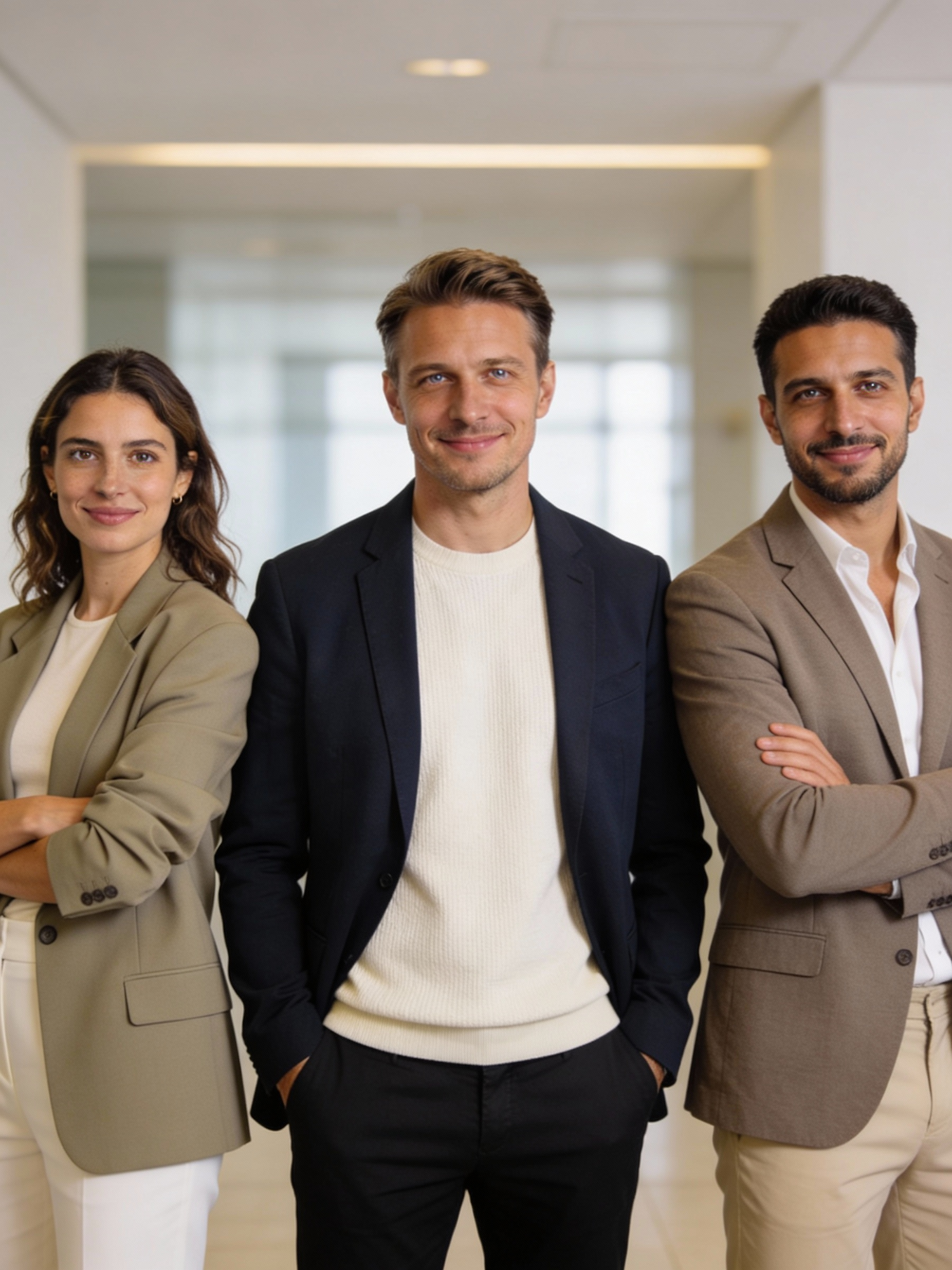 Three professionals in business casual attire smiling confidently in a modern office setting.