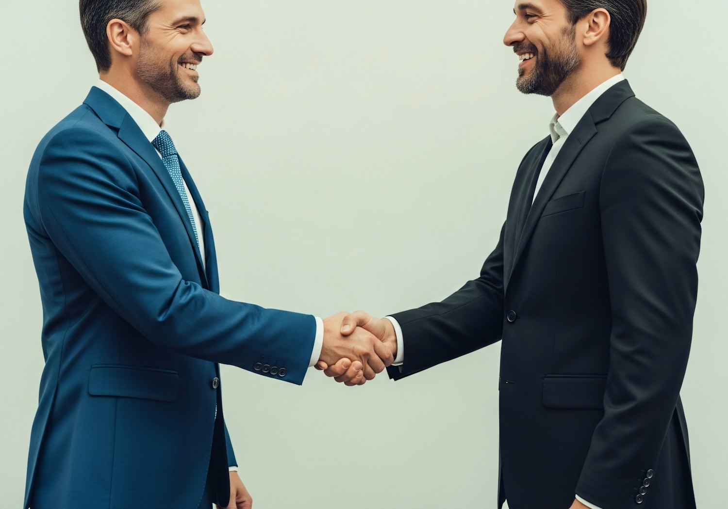 Two men in formal suits shaking hands, smiling warmly, symbolizing agreement or partnership in a professional setting.