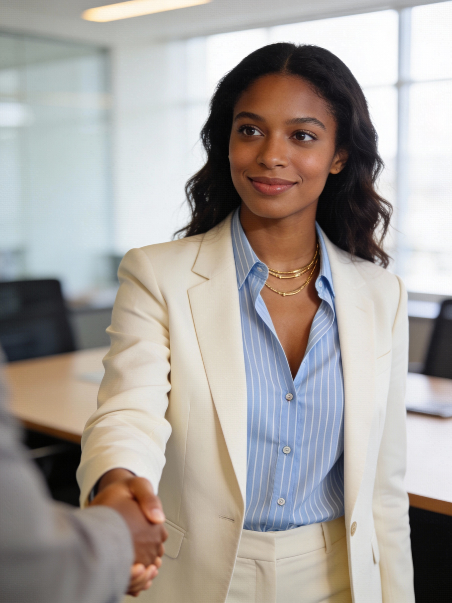 Ultra-realistic corporate lifestyle photo of a confident Mauritian woman, age 29; medium brown warm skin; long dark wavy hair; minimal makeup. Outfit: cream tailored blazer open over light blue vertical-striped button-down (collar open, no logos), matching trousers implied. Jewelry: delicate layered gold necklaces. Scene: in a bright office meeting area near a desk. Framing: tight chest-up close-up, eye-level; handshake visible at lower edge. Pose: handshake with relaxed shoulders; captured at the end of a small nod. Expression: professional and composed—neutral mouth with a faint polite smile, attentive eyes. Eye direction: looking at the other person, not camera. Other person: only hand/arm visible, strongly blurred, no identifiable features. Background: modern office bokeh, strongly blurred. Lighting: soft window daylight + fill, subtle rim, premium corporate/editorial retouch. 85mm look, shallow depth of field, warm-neutral grade. No readable text, no logos, no watermark.